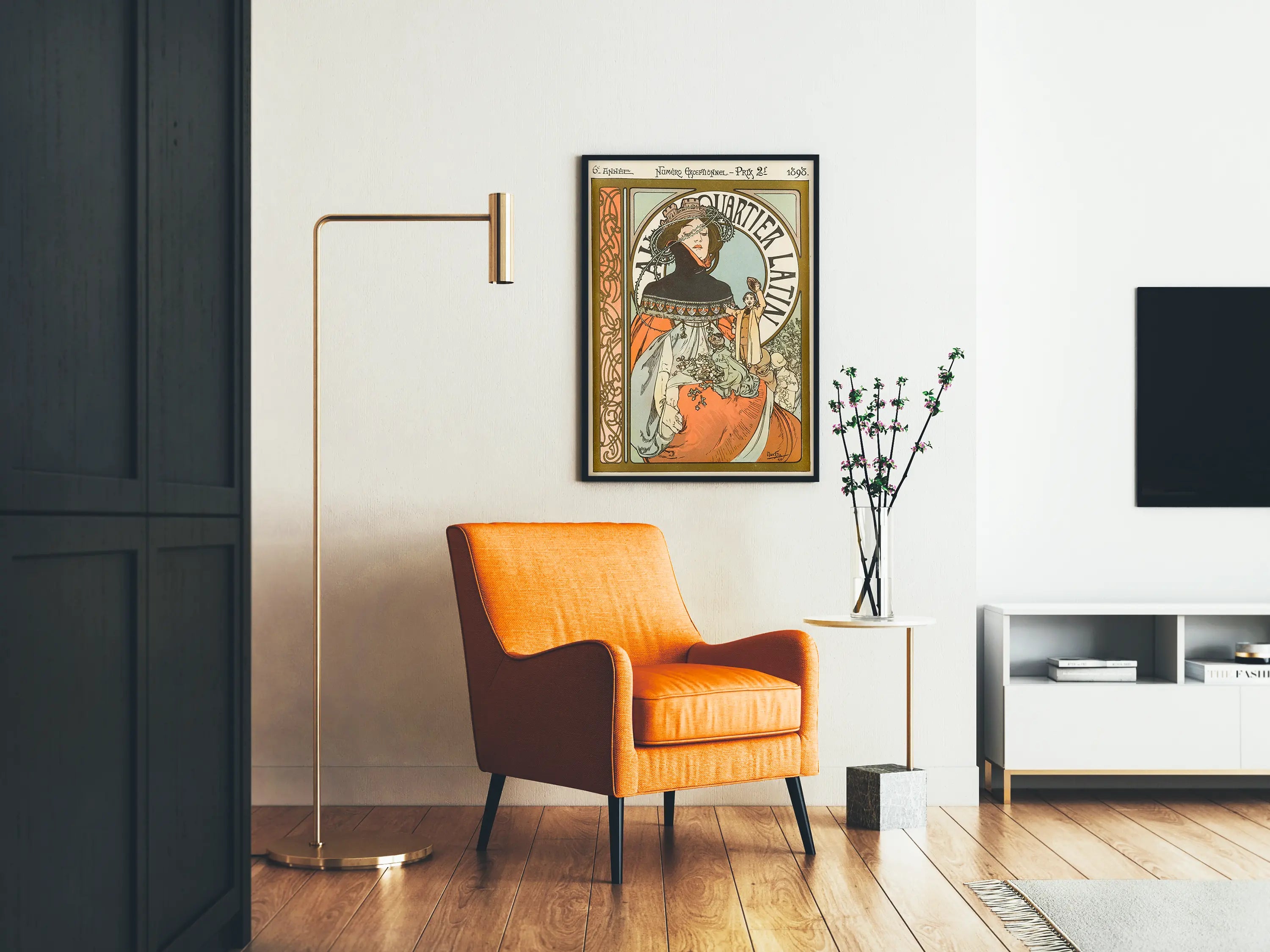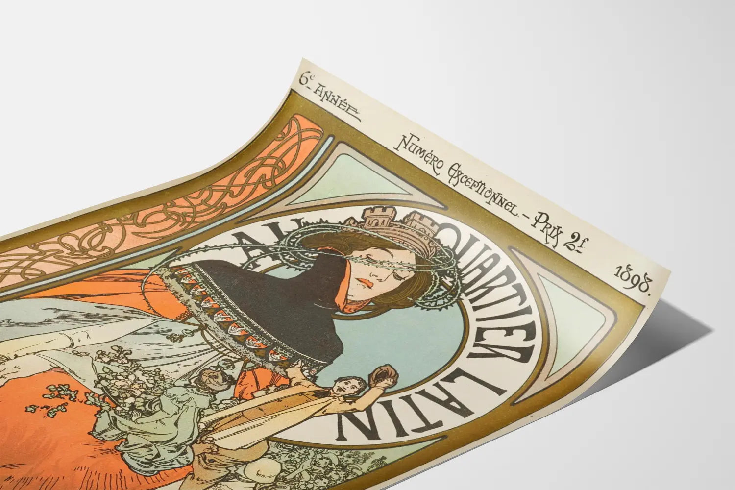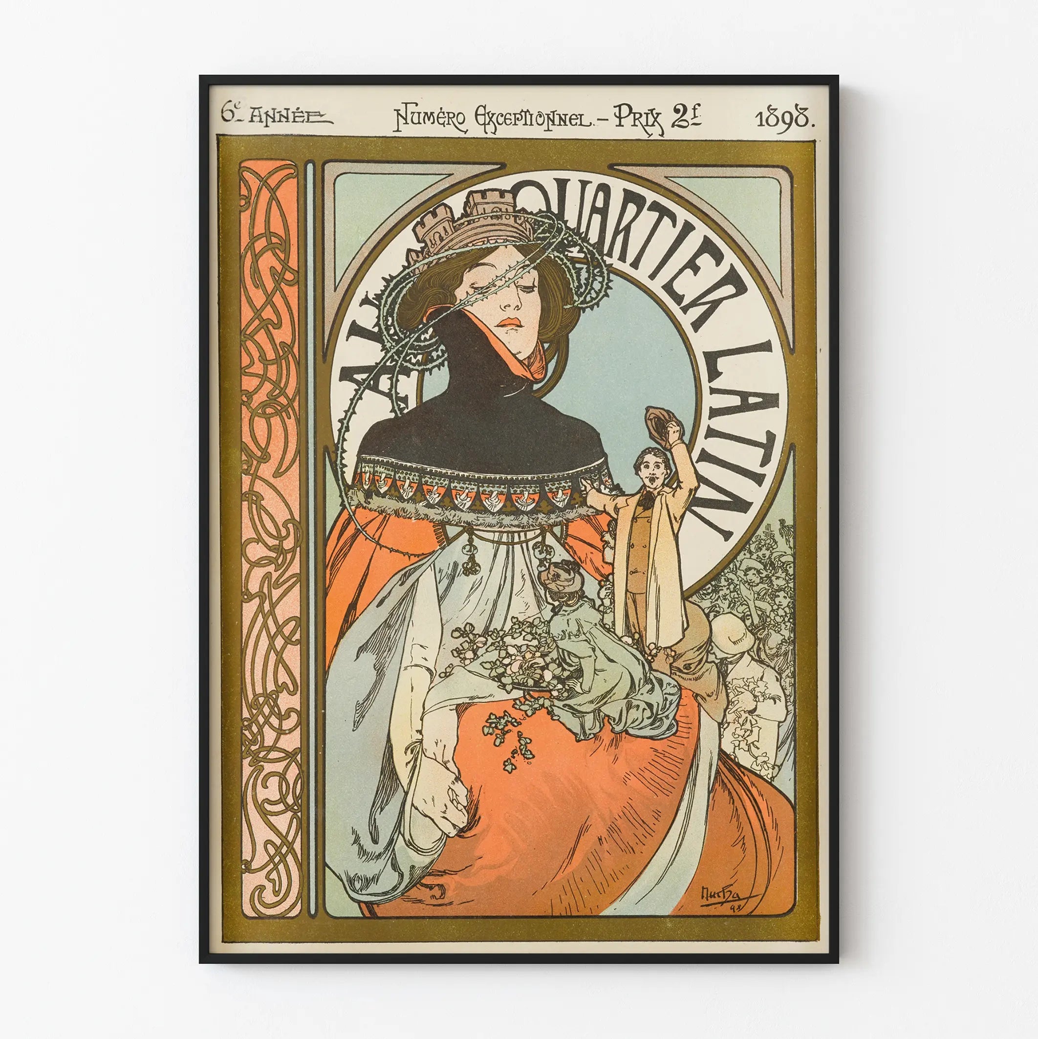 Este cartel vintage de estilo Art Nouveau, fechado en 1898, es una pieza emblemática de la decoración mural inspirada en la Belle Époque. Ilustra una escena evocadora del barrio latino en París, destacando una figura femenina elegante vestida con un vestido amplio en tonos anaranjados y grises, adornada con motivos delicados y accesorios típicos de la época. Esta obra se distingue por sus líneas sinuosas y sus formas estilizadas características de este movimiento artístico, así como por un marco decorativo rico en arabescos y motivos florales, que realzan la sofisticación del conjunto. Esta decoración mural es ideal para los amantes del arte vintage y la historia, aportando un toque de elegancia y nostalgia a cualquier interior. Invita a una inmersión visual en la atmósfera cultural y animada del barrio latino, famoso por sus cafés y su ambiente literario. Este cartel es una elección perfecta para decorar una sala de estar, una oficina o un salón en busca de un toque histórico y artístico, disfrutando además de un estilo gráfico único que capta la atención y despierta la curiosidad. Por su estética atemporal y la riqueza de los detalles, este cartel constituye una decoración mural destacada, combinando armoniosamente historia, arte y diseño para realzar sus espacios.