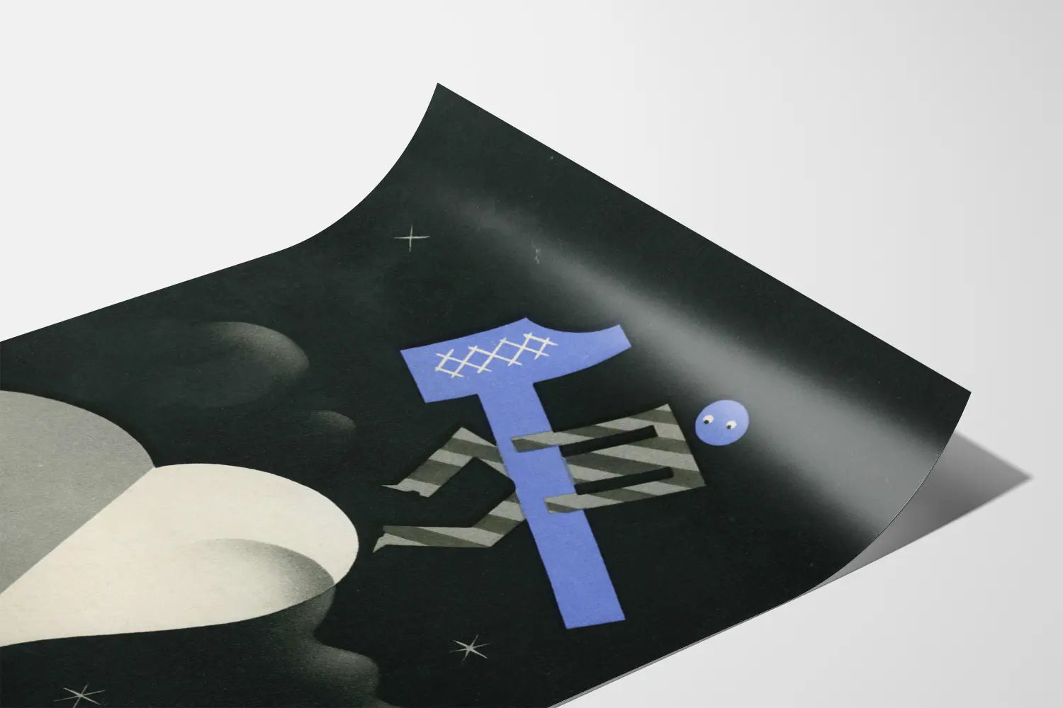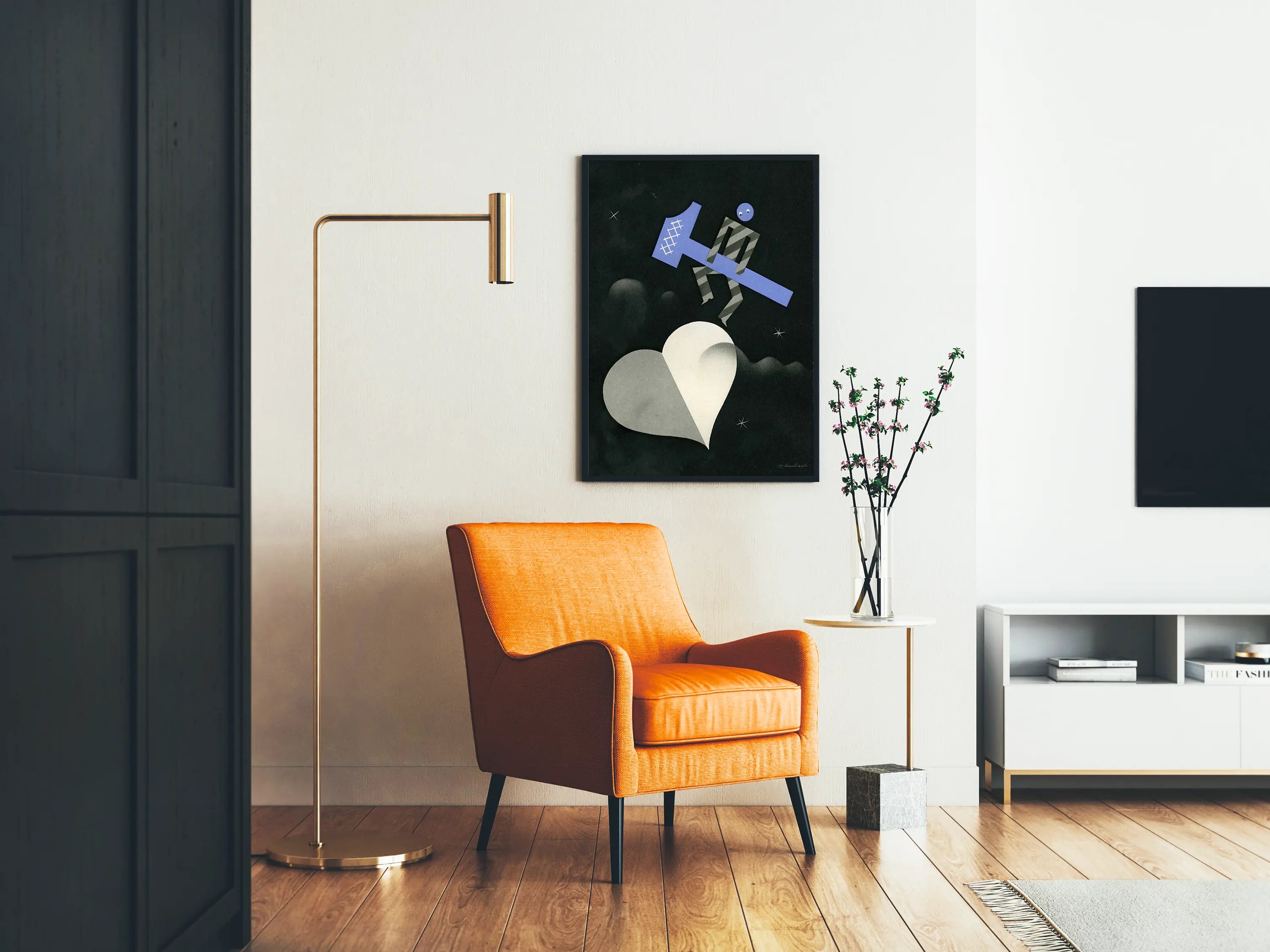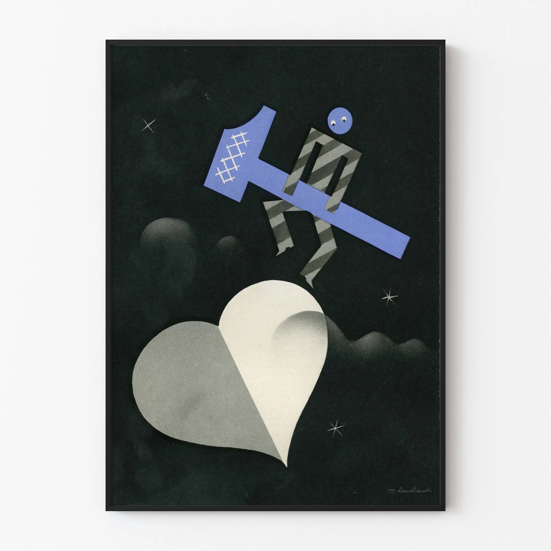 Este cartel decorativo aporta un toque de originalidad y modernidad a su decoración mural gracias a su diseño abstracto y minimalista. Sobre un fondo oscuro, un personaje geométrico compuesto por formas sencillas se destaca. Este personaje, formado por un círculo azul para la cabeza y un cuerpo y extremidades con líneas grises rayadas, parece sostener un gran objeto con forma geométrica azul vibrante. Debajo, un corazón estilizado, dividido en partes grises y blancas, crea un contraste gráfico potente, acentuado por las formas depuradas y las tonalidades sutiles. El fondo negro, salpicado de pequeñas estrellas blancas, aporta una atmósfera nocturna y ligeramente onírica a esta composición. Este cartel encaja perfectamente en un universo de decoración contemporánea, combinando formas geométricas, colores contrastados y sencillez figurativa. Representa una decoración mural original que atraerá la mirada, aportando a la vez un carácter único y artístico a un interior. Perfecto para embellecer una sala, un dormitorio o un espacio de trabajo, este cartel combina bien tanto con una decoración moderna como minimalista. Este póster ofrece un equilibrio estético entre abstracción y simbolismo, con los elementos del corazón y del personaje, evocando temáticas como la emoción, la búsqueda o la conexión humana, manteniendo una interpretación lo suficientemente abierta para el sentido personal. Como elemento decorativo mural, permite añadir un toque artístico y contemporáneo, ideal para quienes buscan un objeto mural tanto decorativo como portador de significado. Coloque este cartel en su espacio para dinamizar su ambiente interior con un estilo gráfico y moderno, disfrutando a la vez de una obra mural que despierta curiosidad y reflexión visual.