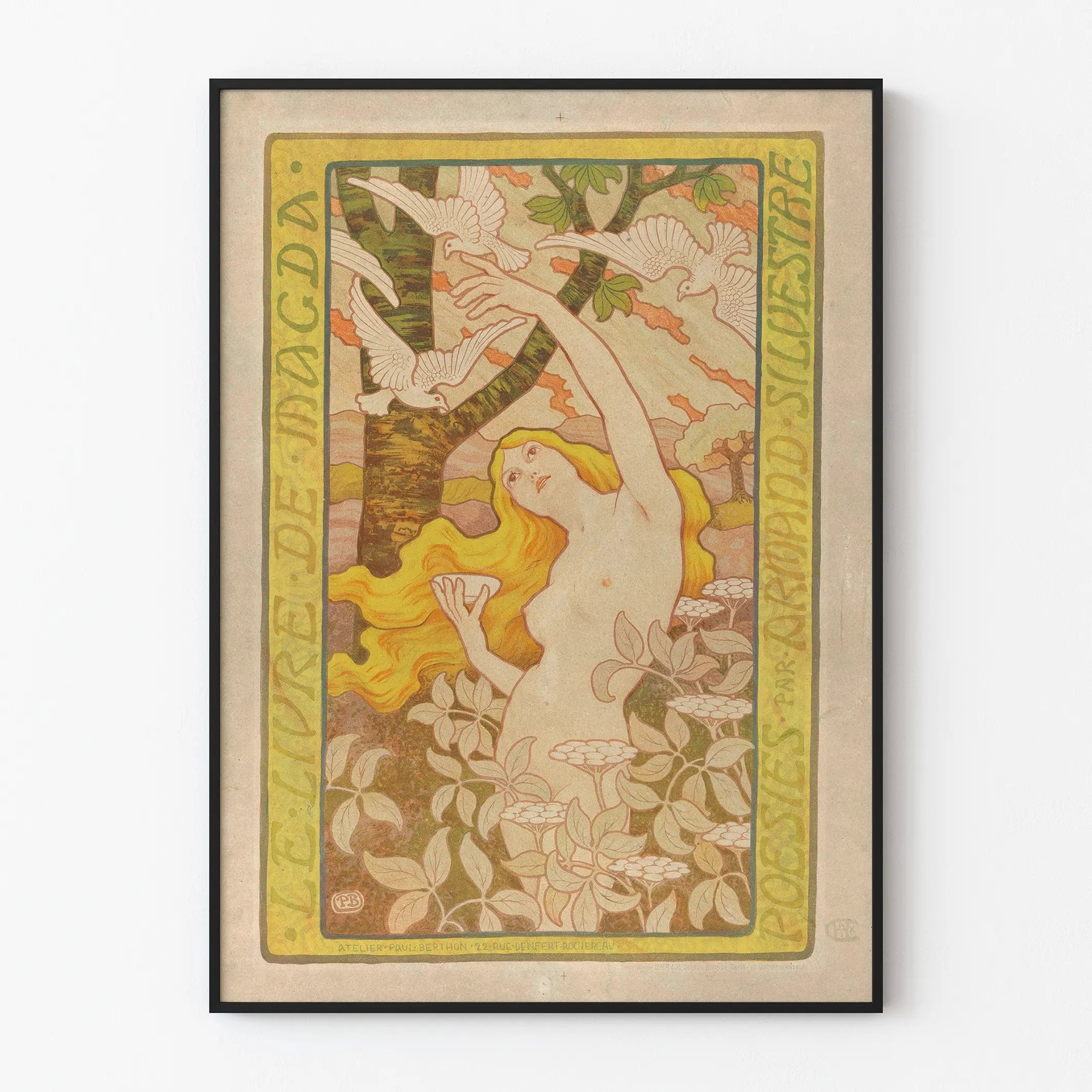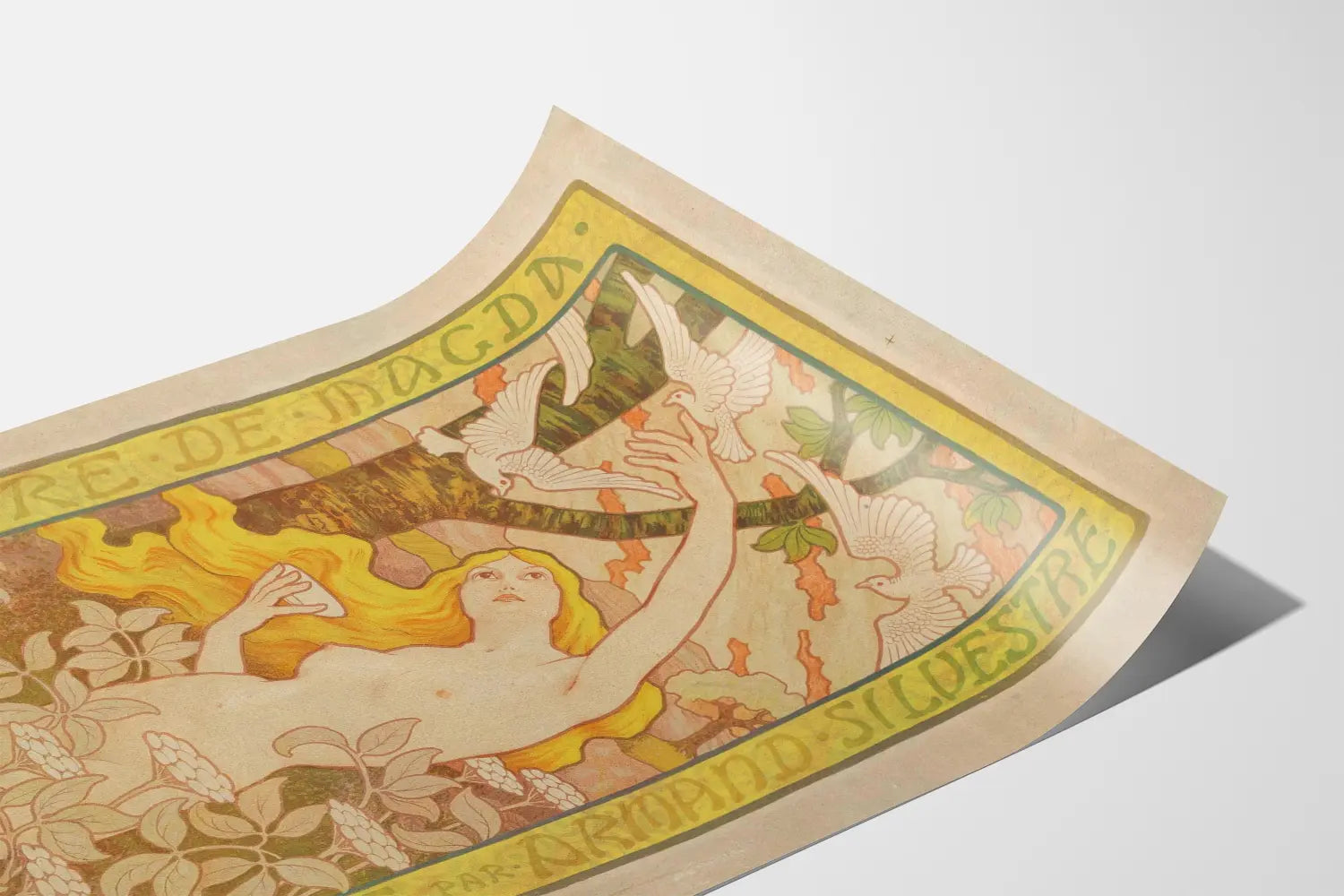 Descubra esta cartelera única inspirada en la obra "El Libro de Magda" de Armand Silvestre, ofrecida en formato póster para una decoración mural elegante y artística. Este cartel ilustra una composición delicada y poética, típica del espíritu decorativo, que presenta a una mujer desnuda con largos cabellos dorados, rodeada de un paisaje floral estilizado y palomas en pleno vuelo. La paleta de colores suaves, que combina tonos cálidos como el amarillo, el beige y matices de verde, crea una atmósfera dulce y soñadora que aporta un toque vintage y refinado a cualquier interior. Esta decoración mural se inspira en las estéticas clásicas y simbolistas, valorando la belleza femenina y la naturaleza en un marco armonioso. Enmarcada con un marco ornamental con inscripciones manuscritas, esta cartelera poética es perfecta para aportar un toque artístico a las paredes, ya sea en una sala, un dormitorio o una oficina. Su calidad de impresión y su estilo retro la convierten en un objeto decorativo ideal para los amantes del arte y quienes desean incorporar un ambiente suave, imaginativo y lleno de encanto en su entorno. Este póster es una invitación a la contemplación y a la evasión, reflejando una destreza artística minuciosa y un diseño cuidadosamente pensado que se ajusta plenamente a las tendencias actuales de decoración mural. Embellezca sus paredes con esta cartelera original y refinada, diseñada para realzar su espacio y aportar un toque de elegancia y poesía visual.