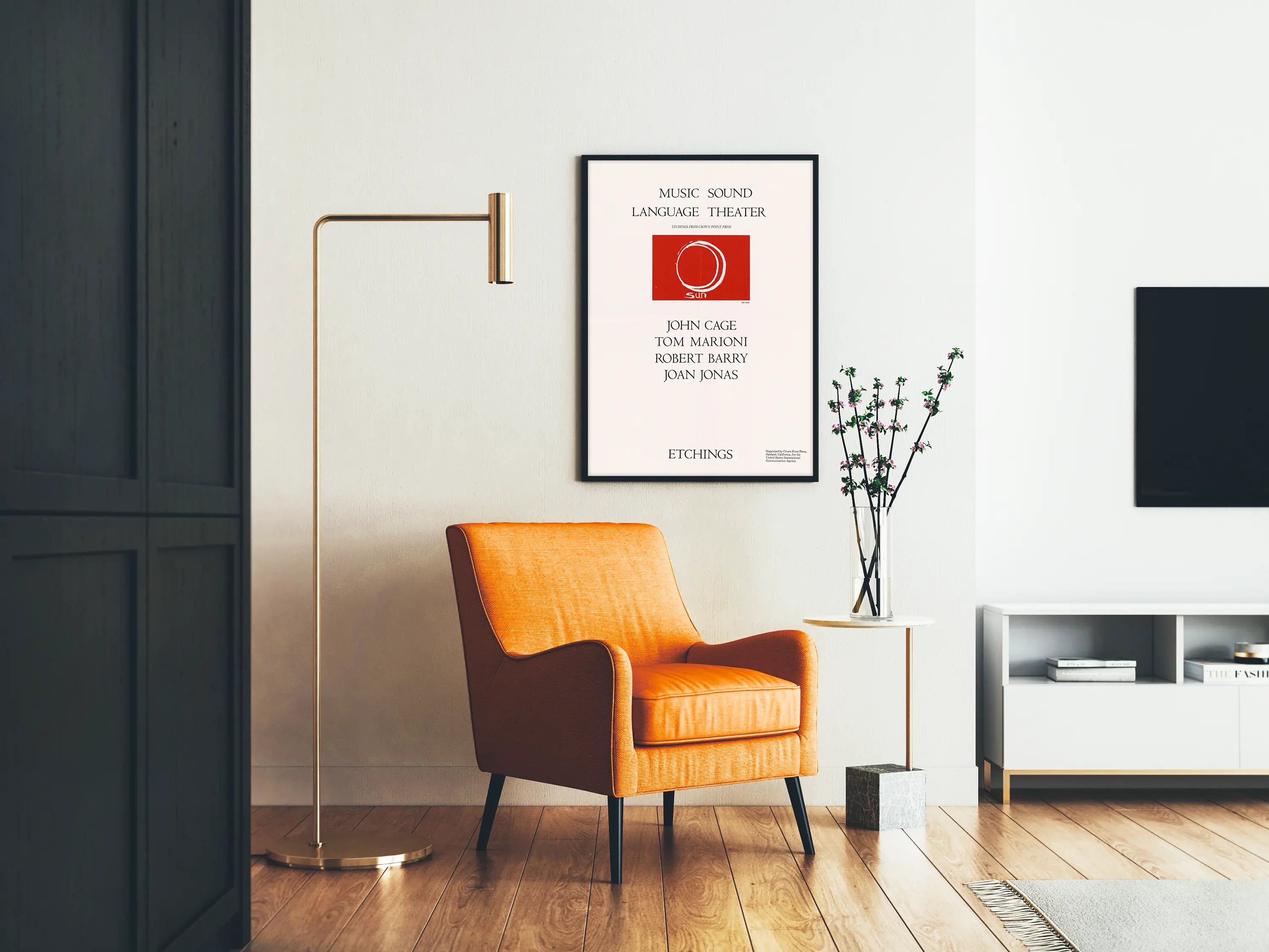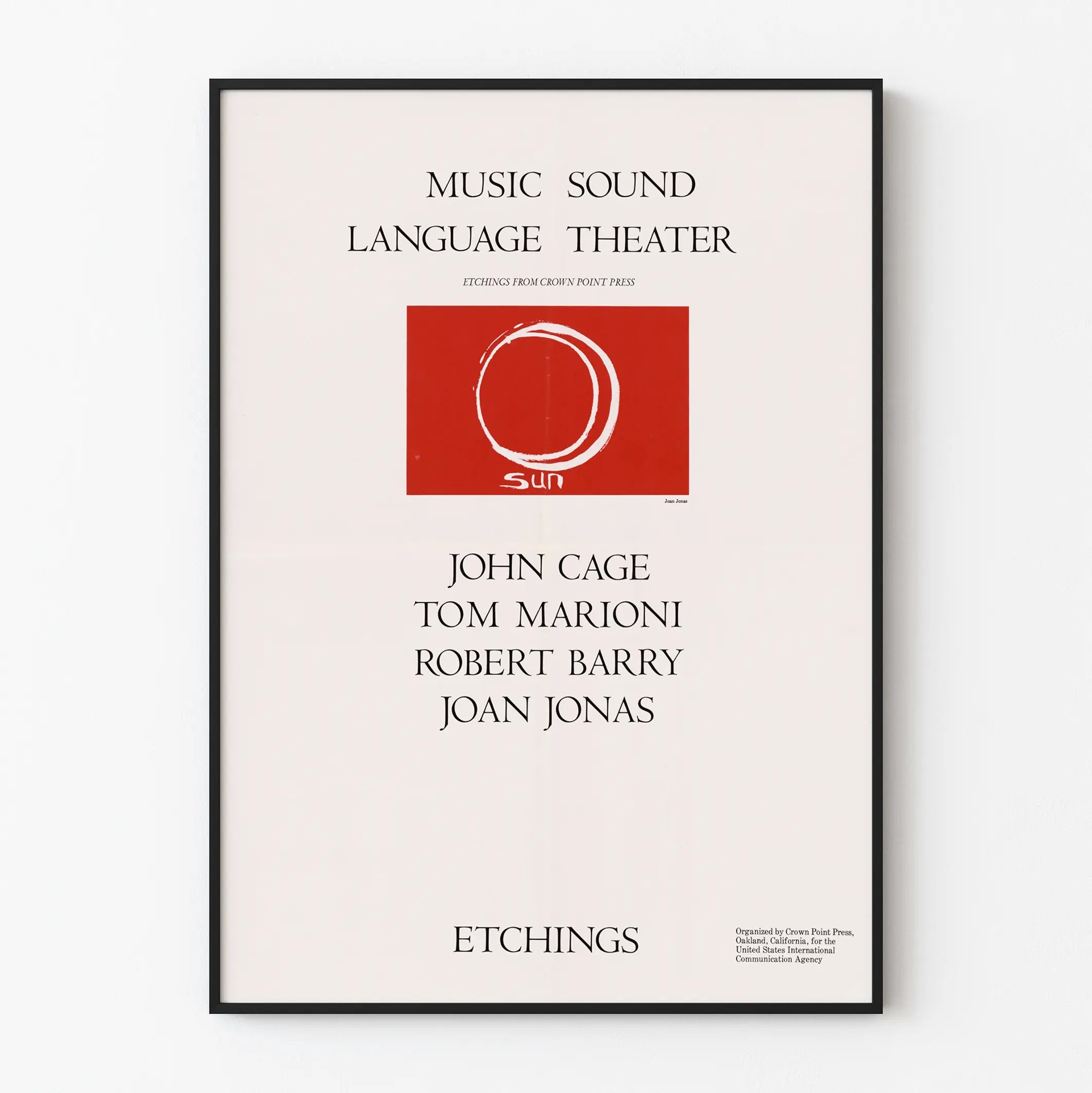 Este cartel artístico titulado "Lenguaje, Sonido, Música y Teatro" presenta una composición sencilla y moderna que gira en torno a temas relacionados con la música, el sonido, el lenguaje y el teatro. Destaca una estampilla central en rojo y blanco que representa un círculo estilizado acompañado de la palabra "sol" escrita en la parte inferior, aportando un contraste dinámico a toda la pieza. Este cartel juega con una tipografía elegante y fina, dispuesta de manera espaciosa, que resalta el carácter artístico y conceptual de la imagen. La mención "Grabados de Crown Point Press" indica que se trata de una obra grabada, reforzando su aspecto auténtico y original en el ámbito de la decoración mural. El nombre de varias figuras artísticas como John Cage, Tom Marioni, Robert Barry y Joan Jonas aparece en la parte inferior, destacando una referencia cultural fuerte a las artes contemporáneas y a la performance. Este cartel encaja perfectamente en un entorno moderno y artístico, ideal para decorar un interior con un toque de sofisticación y vanguardia. La composición gráfica sencilla pero expresiva es adecuada para resaltar en espacios dedicados a la cultura, la música o el diseño de interiores. Con sus colores minimalistas y su estilo reconocible, este cartel se impone como una pieza clave para una decoración mural artística que estimula la reflexión y la inspiración. Su formato y estilo lo convierten en una opción adecuada para aficionados al arte contemporáneo que desean enriquecer su espacio con una obra gráfica impactante.