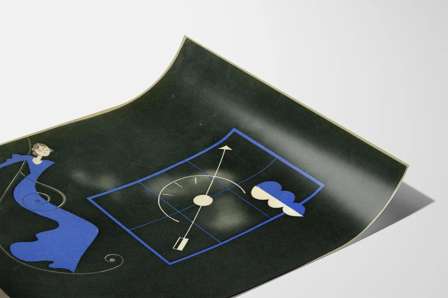 El uso de una paleta limitada, principalmente el negro, el azul y toques de beige, confiere al cartel una atmósfera suave y tranquilizadora, resaltando el contorno fluido de la mujer y los detalles gráficos de la escena. Este contraste de colores atrae naturalmente la vista y dinamiza el espacio donde se instalará este cartel.
