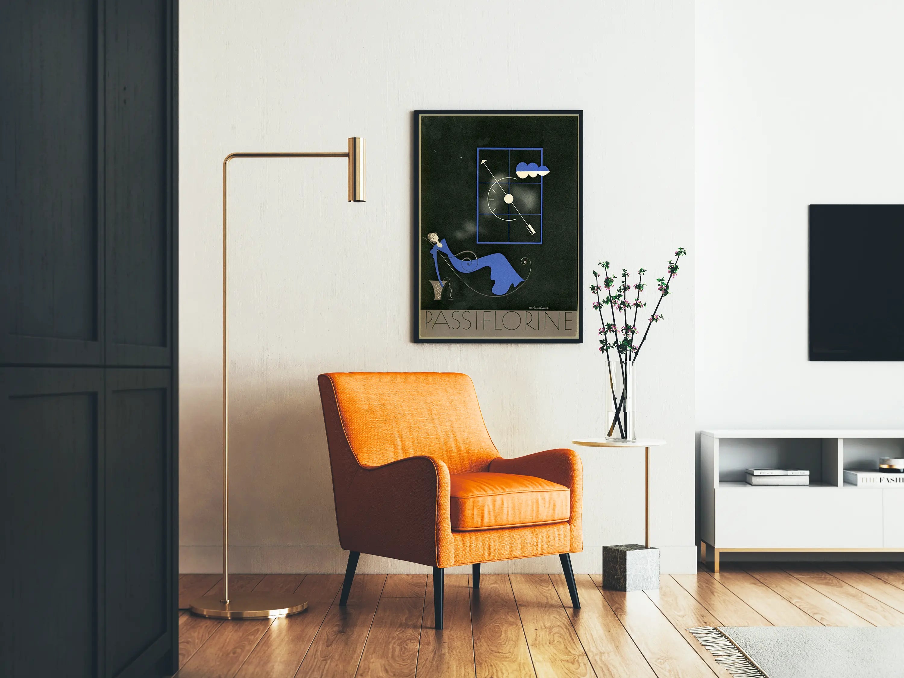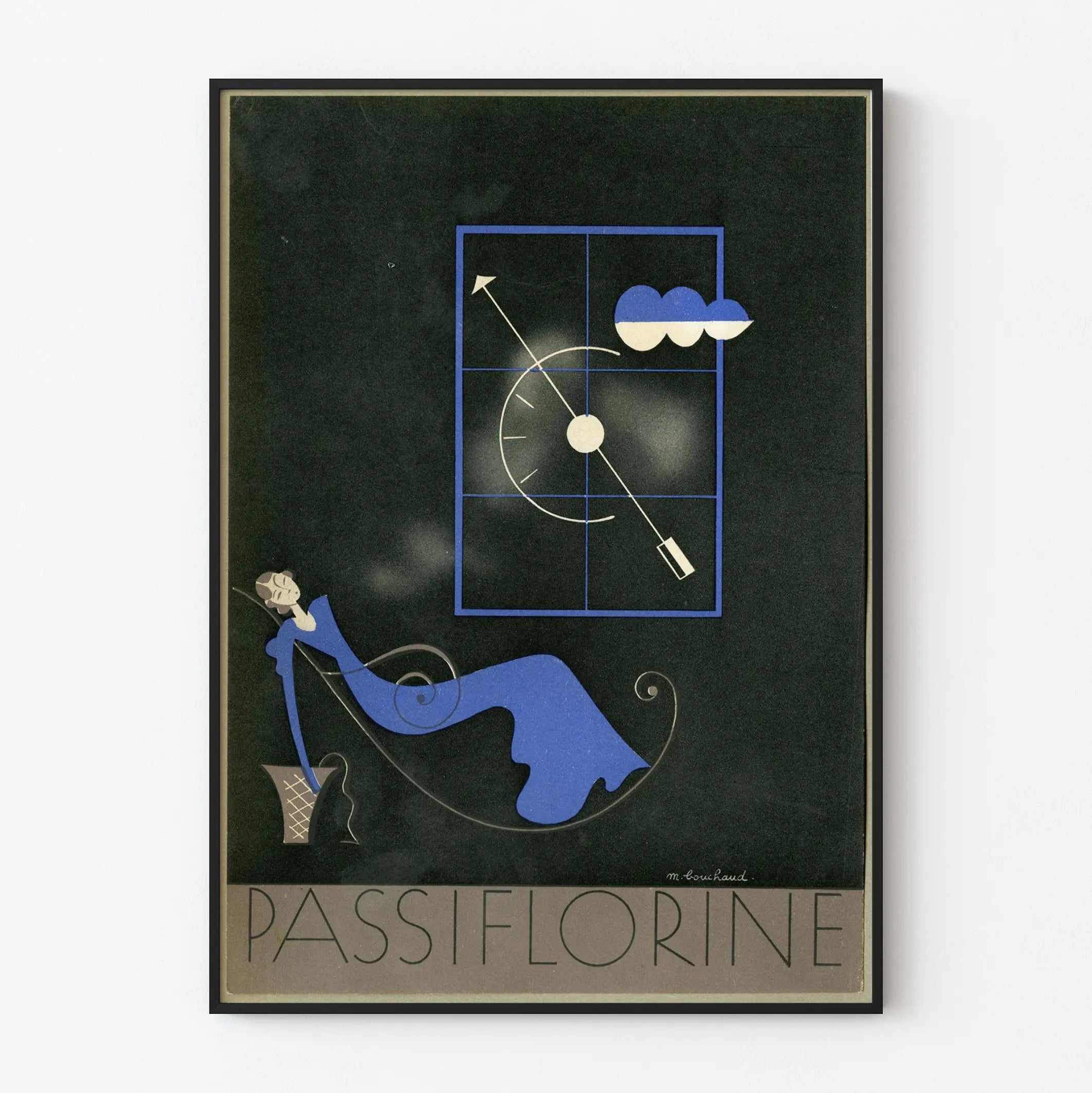 Este cartel artístico titulado "Passiflorine" ofrece una decoración mural a la vez elegante y moderna, perfecta para enriquecer un interior con un toque de sofisticación. Sobre un fondo oscuro, se revela una ilustración minimalista y estilizada que representa a una mujer con vestido largo azul real, sentada en un sillón de líneas sinuosas y gráficas. El personaje, con una postura relajada y extendida, transmite una sensación de calma y ensueño, acentuada por las curvas elegantes de su cuerpo y del sillón.