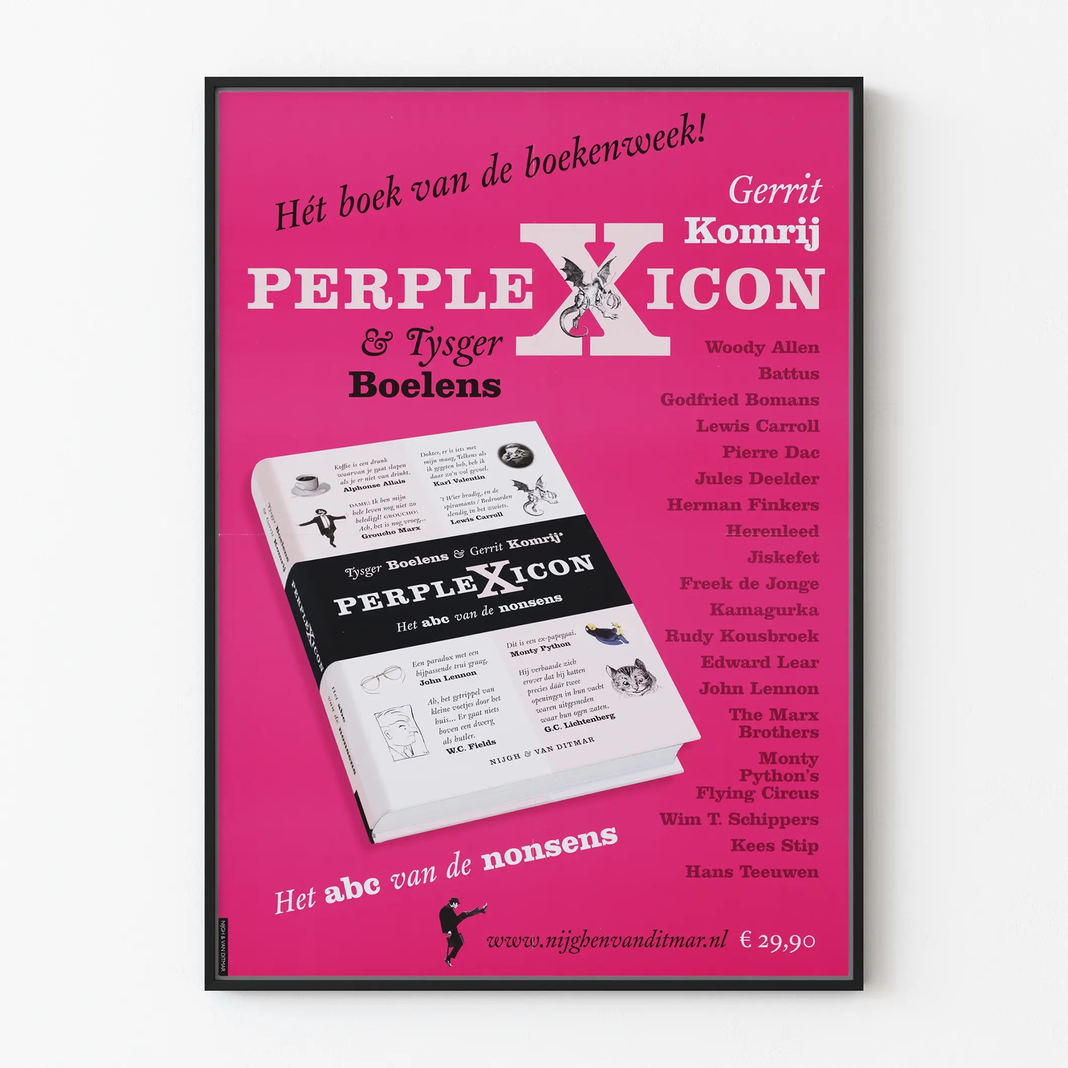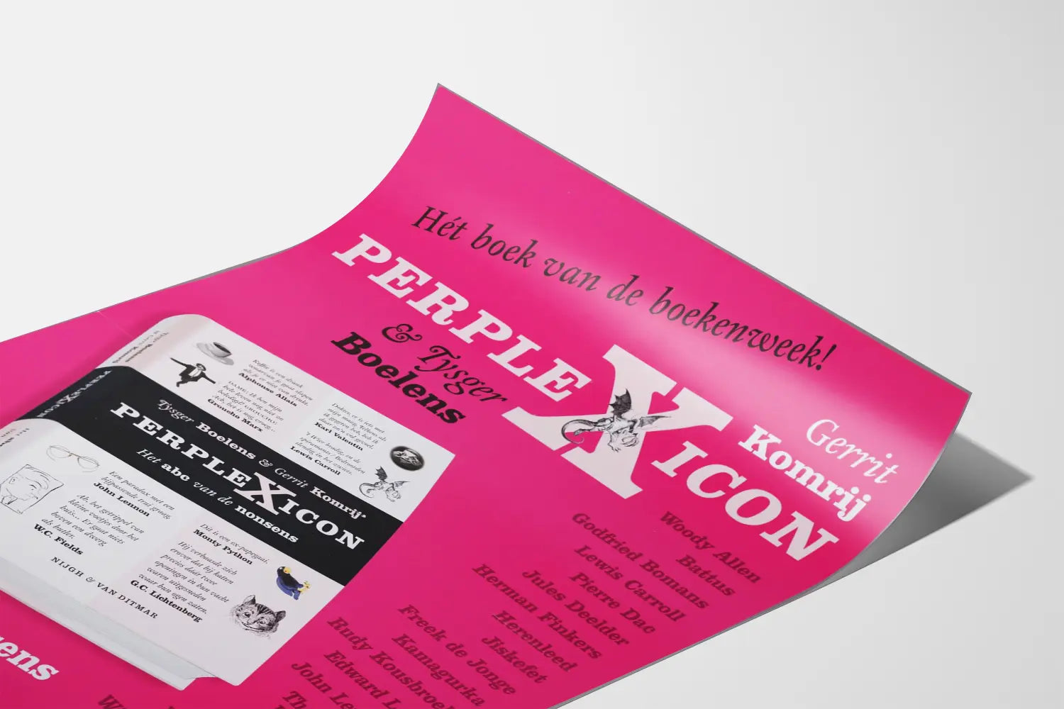 Este cartel colorido y dinámico presenta el libro "Perplexicon", una obra coescrita por Gerrit Komrij y Tysger Boelens. Perfecto para los amantes de la decoración mural original, este cartel destaca una composición visual audaz sobre un fondo rosa brillante, con una imagen realista del libro en perspectiva. El diseño combina tipografías variadas y juega con el contraste de las fuentes, reforzando así el carácter gráfico y contemporáneo de la pieza.