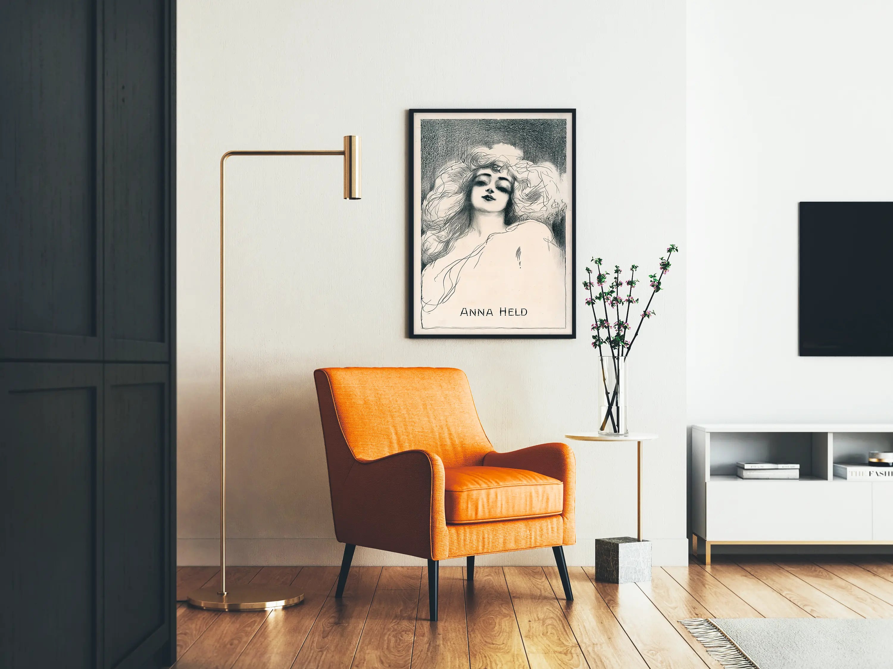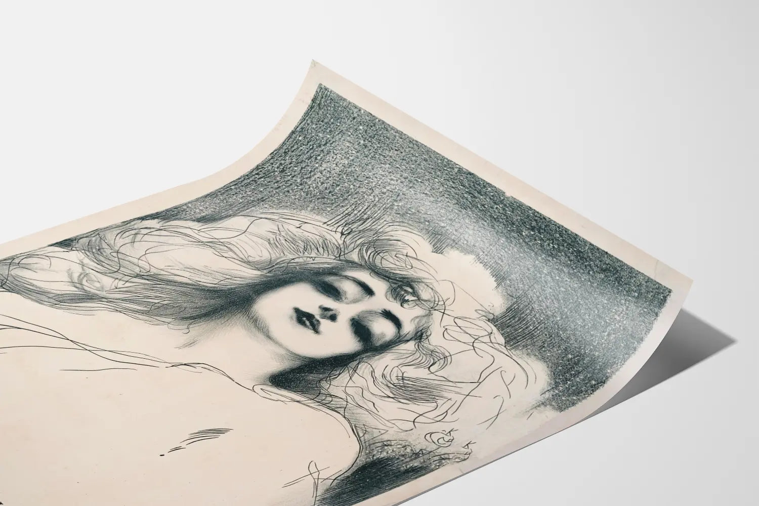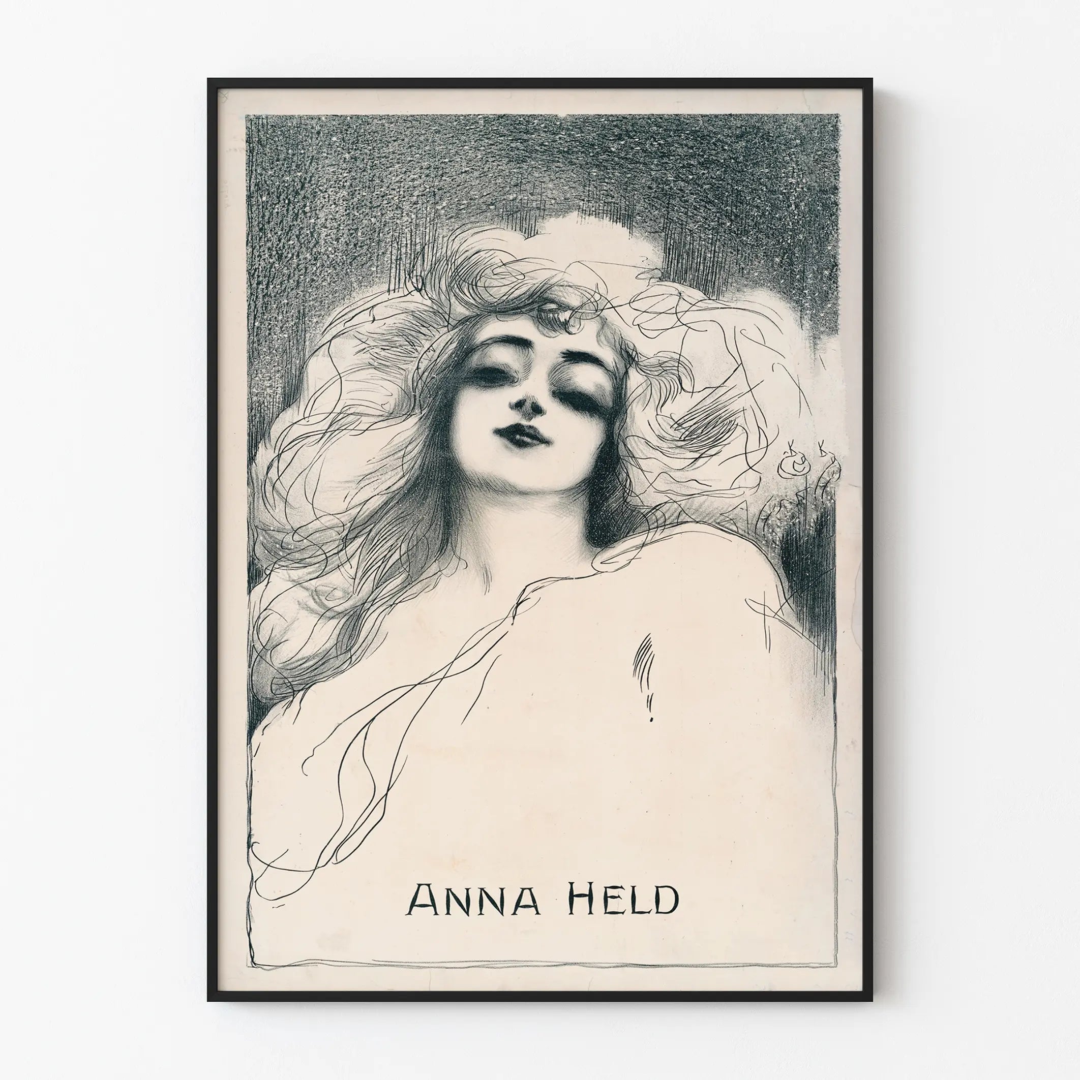 Descubra este cartel artístico vintage que representa a Anna Held, una creación en litografía notable por la finura del dibujo y la delicadeza de los trazos. Este cartel destaca un retrato femenino estilizado, capturando una expresión a la vez misteriosa y cautivadora, con detalles expresivos en el cabello y el rostro realizados con lápiz o carboncillo, sobre un fondo sombreado en contraste. Esta decoración mural encaja perfectamente en un universo retro y elegante, ideal para aportar un ambiente artístico y cultural a su interior. El dibujo combina líneas ligeras y sombreados precisos, revelando una técnica gráfica tradicional, ofreciendo así una pieza decorativa auténtica y llena de carácter. Este cartel de Anna Held es especialmente adecuado para los amantes del arte antiguo, de litografías originales y de composiciones gráficas sutiles. Ya sea para una sala de estar, una oficina o una galería, esta obra mural afirma una presencia visual fuerte sin sobrecargar el espacio, gracias a su paleta monocromática suave que se integrará fácilmente con cualquier tipo de decoración. Al incorporar este cartel en su colección, opta por un elemento decorativo único que aporta un toque de historia y estética clásica a sus paredes. Este cartel mural está dirigido a todos aquellos que desean enriquecer su interior con una ilustración vintage expresiva, diseñada para los apasionados del arte gráfico y de retratos femeninos atemporales.