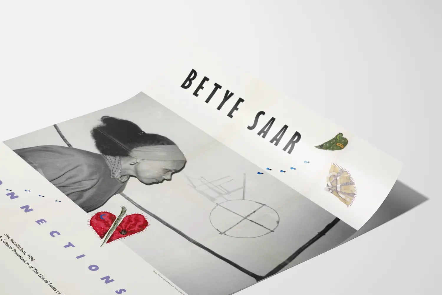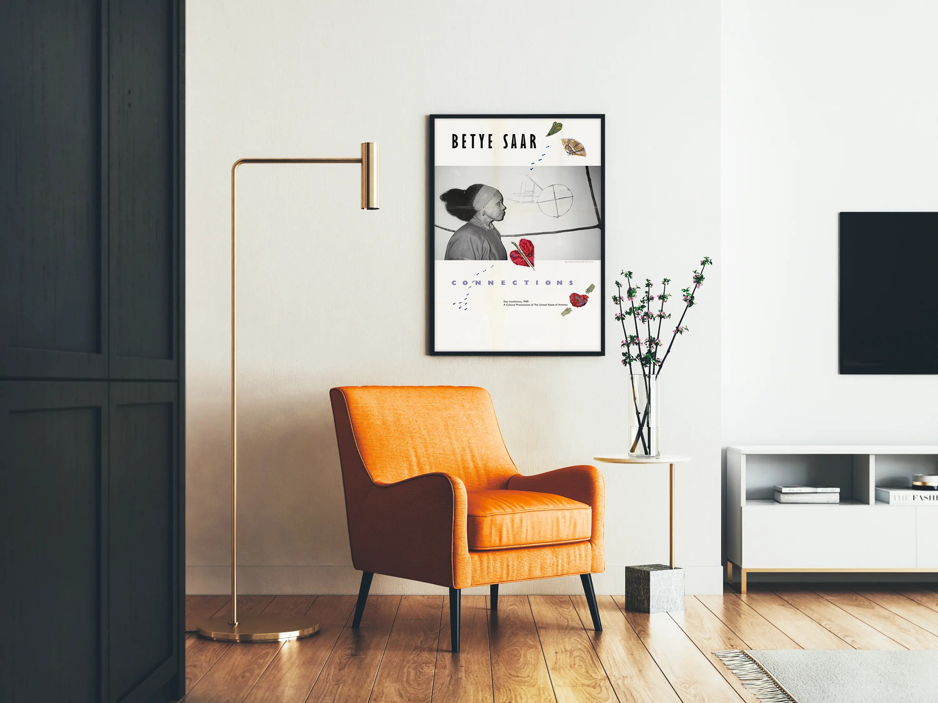 Descubra este cartel vintage titulado « Conexiones » de Betye Saar, una pieza artística única presentada en 1988 en forma de instalación mural. Este cartel combina una fotografía en blanco y negro de una mujer de perfil con elementos gráficos coloridos y simbólicos, como corazones rojos espinosos, pequeños detalles azules, manos verdes y formas abstractas orgánicas. Estos elementos decorativos aportan un contraste vivo y dinámico a la composición monocromática, acentuando el mensaje artístico. Este cartel representa una época y un estilo que fusionan fotografía y collage para ofrecer una decoración mural llena de significado y recuerdos culturales, perfecta para los amantes del arte y la decoración de interiores. El cartel está firmado en la esquina inferior derecha, lo que garantiza una autenticidad visual y artística. Al elegir esta decoración mural, introduce tanto una obra de arte visual impactante como una historia cultural sutil en su hogar. Este cartel se integrará perfectamente en un salón moderno o en un espacio de creación, realzando sus paredes con su estética retro y sus detalles gráficos. Una verdadera pieza de colección para quienes valoran los carteles murales que combinan fotografía y arte contemporáneo visual.