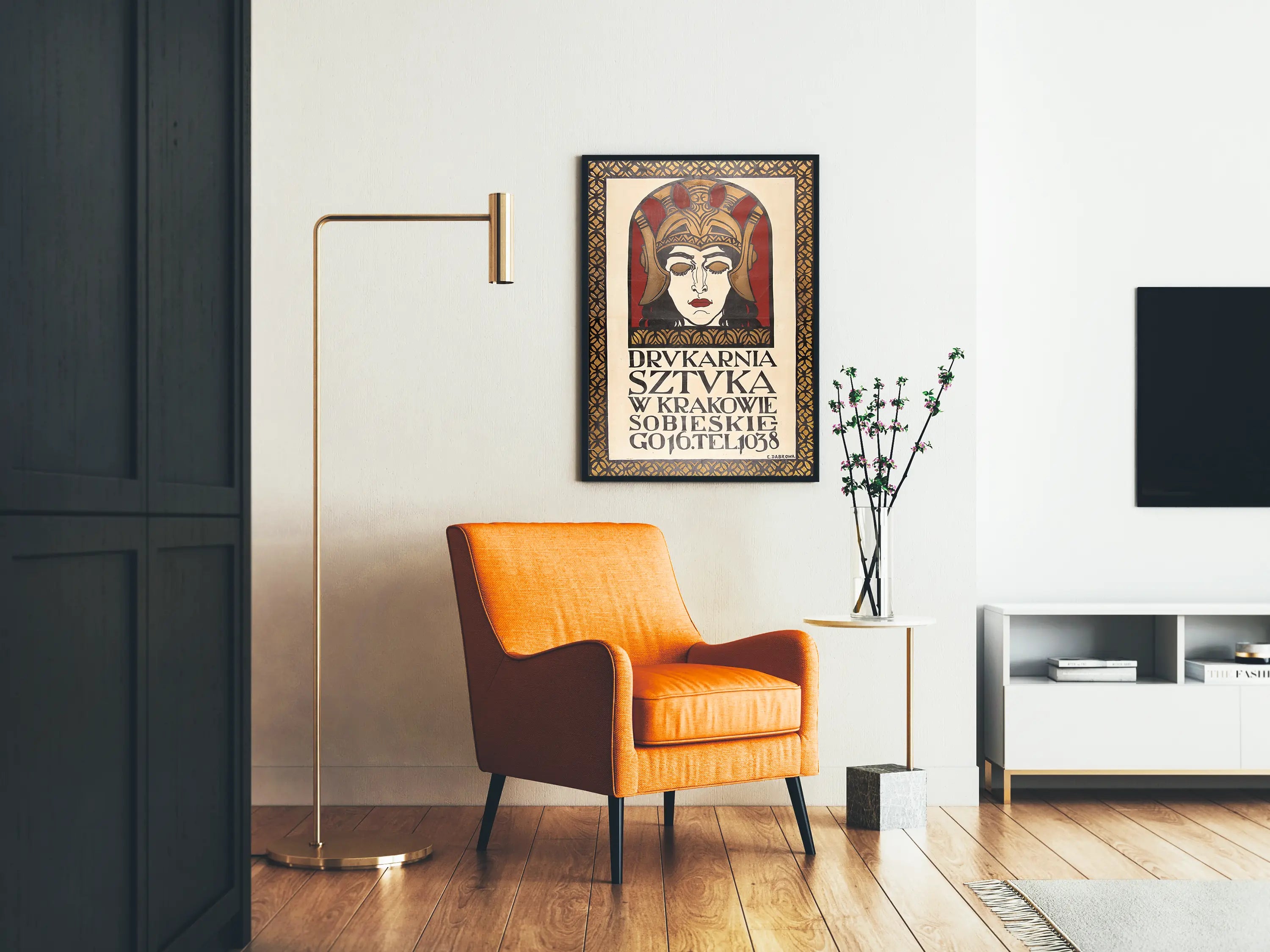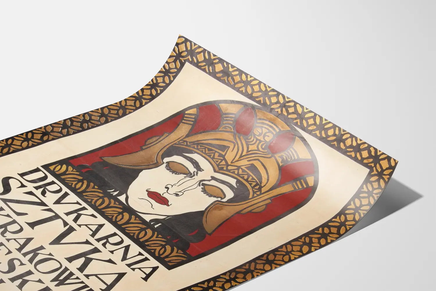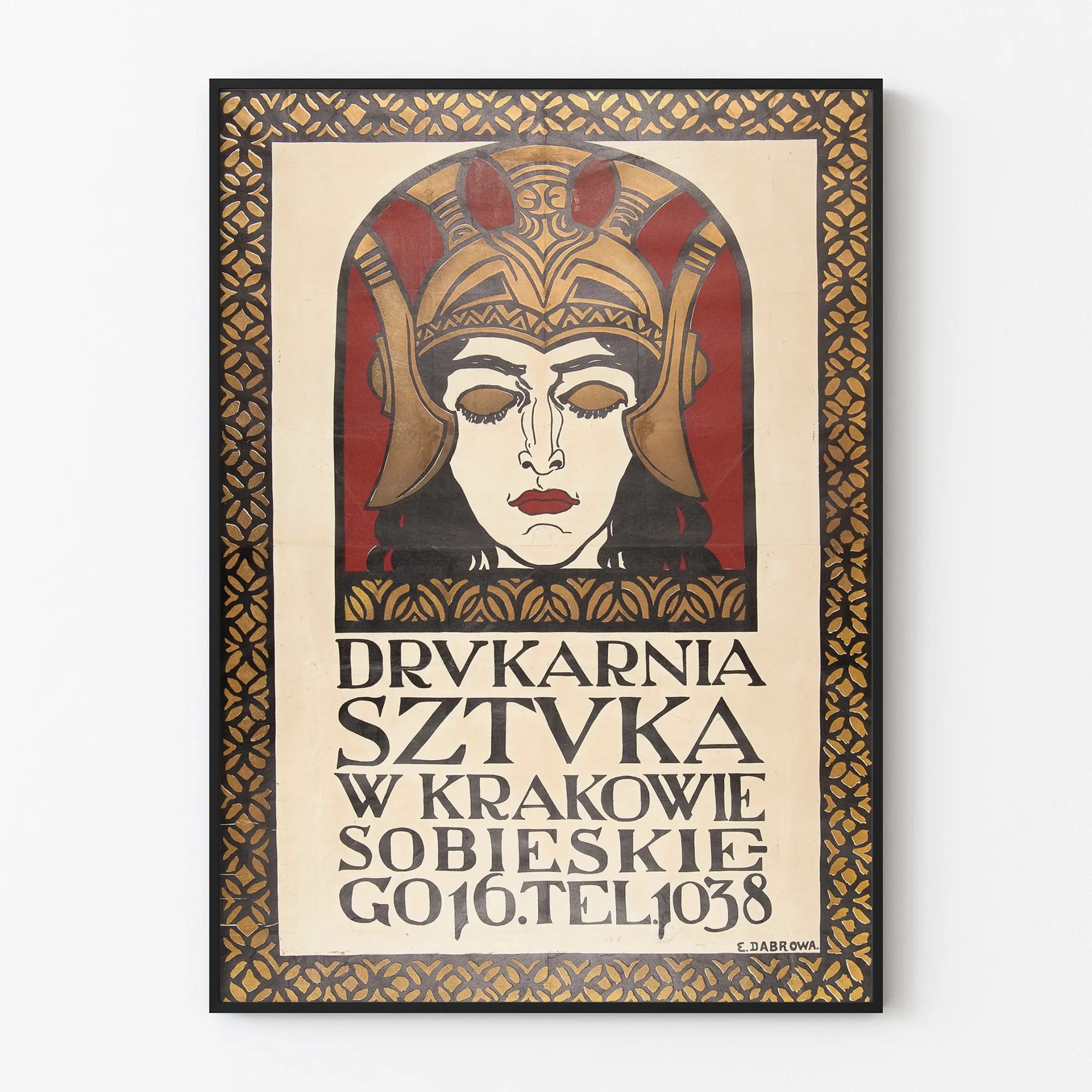 Esta notable cartel vintage presenta una cabeza estilizada de una figura con casco, dibujada con colores predominantes dorado, negro y rojo profundo, enmarcada por un motivo decorativo geométrico repetitivo. Este cartel único evoca un estilo artístico tradicional y poderoso, con un diseño depurado y un impacto visual fuerte. La tipografía en letras mayúsculas, sobria y elegante, menciona "Drukarnia Sztuka w Krakowie", una imprenta artística ubicada en Cracovia, así como detalles de contacto, lo que le confiere un encanto auténtico de época.