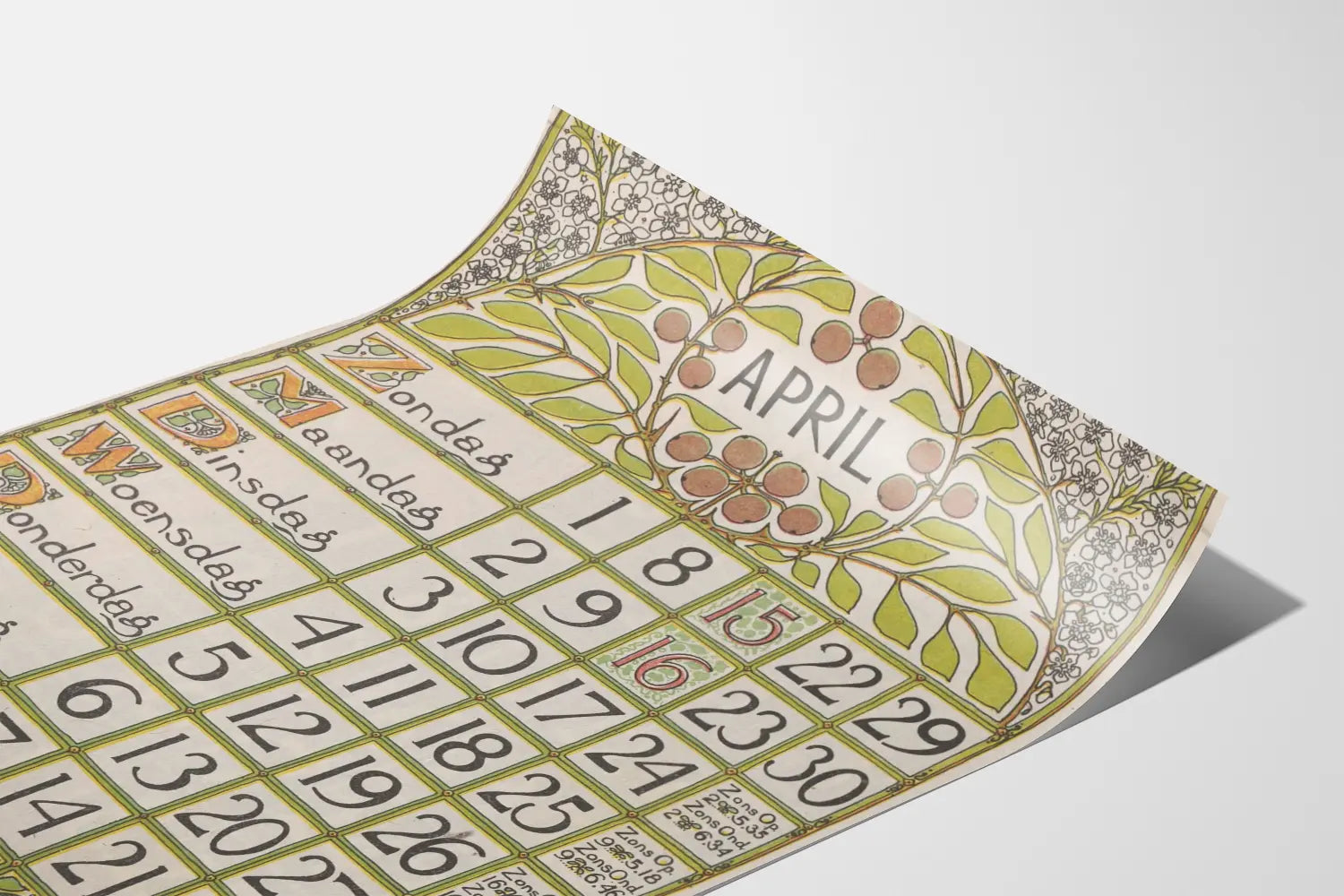 Descubra este cartel calendario del mes de abril de 1900, una pieza única de decoración mural en estilo Art Nouveau. Este cartel original presenta una disposición cuidada entre tipografía elegante y motivos florales estilizados, típicos de principios del siglo XX. Los días de la semana están escritos en neerlandés, con especial atención a las letras mayúsculas adornadas, combinando formas orgánicas y ornamentos delicados que enmarcan armoniosamente cada casilla del calendario. Ideal como elemento decorativo vintage, este cartel aporta un toque histórico y auténtico a su interior. El marco floral en la parte superior del cartel, con colores suaves verdes y marrones, resalta la belleza natural, mientras que la parte inferior ilustra las diferentes fases de la luna con dibujos simbólicos y estilizados, añadiendo una dimensión adicional al diseño. Este cuadro mural no se limita a un simple calendario, sino que se revela como un verdadero objeto de arte gráfico, perfecto para una sala de estar, una oficina o una biblioteca que busque una atmósfera retro y refinada. Para integrar entre otros carteles de estilo antiguo o para aportar un toque artístico único, este cartel es una invitación a la contemplación y al encanto de una época pasada, para los amantes de la decoración mural que valoran la combinación de funcionalidad y estética. La finura del dibujo y la paleta de colores naturales lo convierten en un elemento decorativo versátil que se adapta tanto a un entorno contemporáneo como a una decoración más clásica.