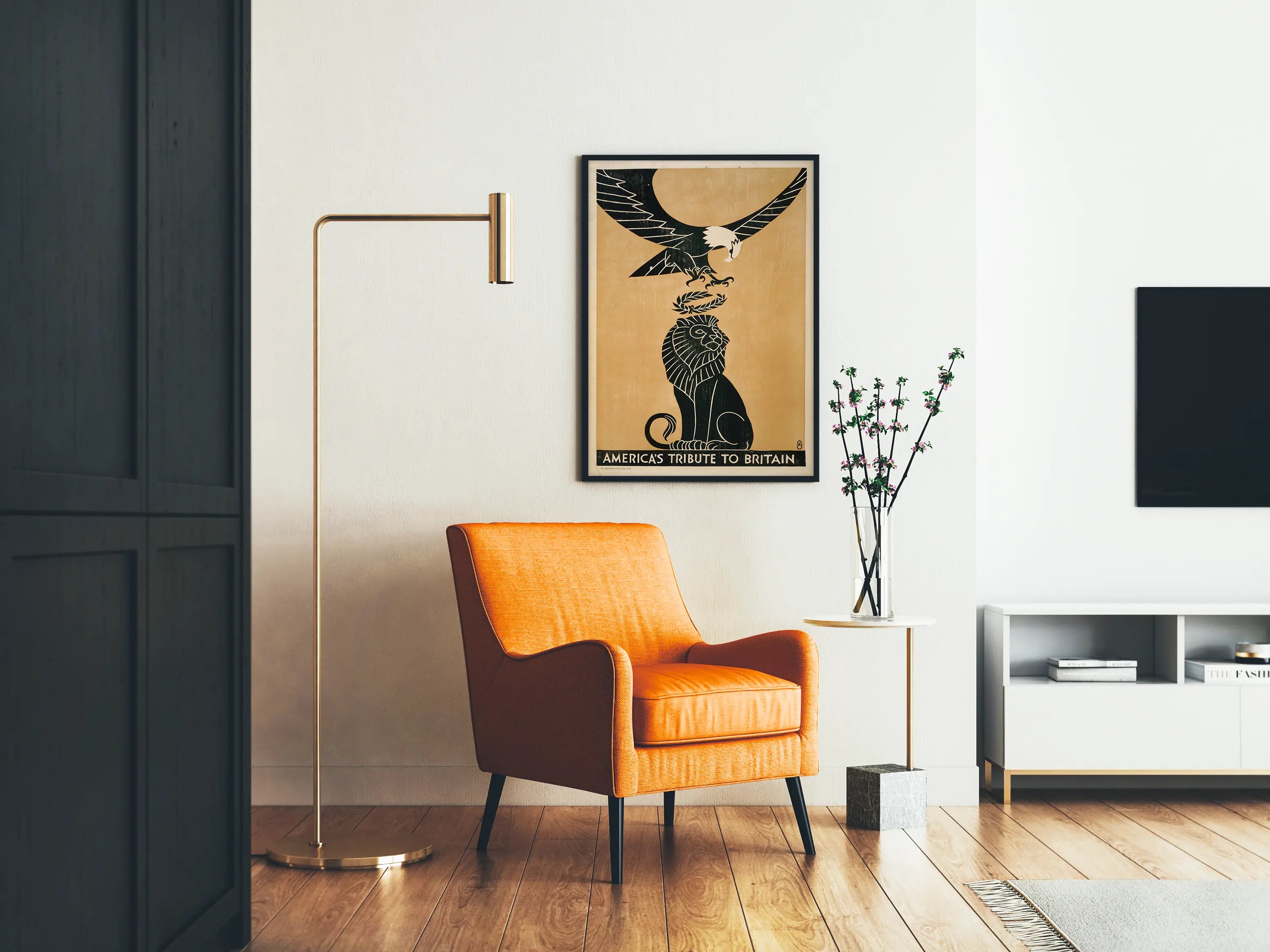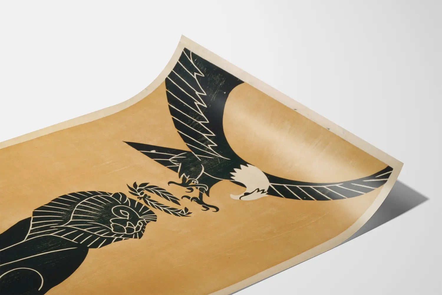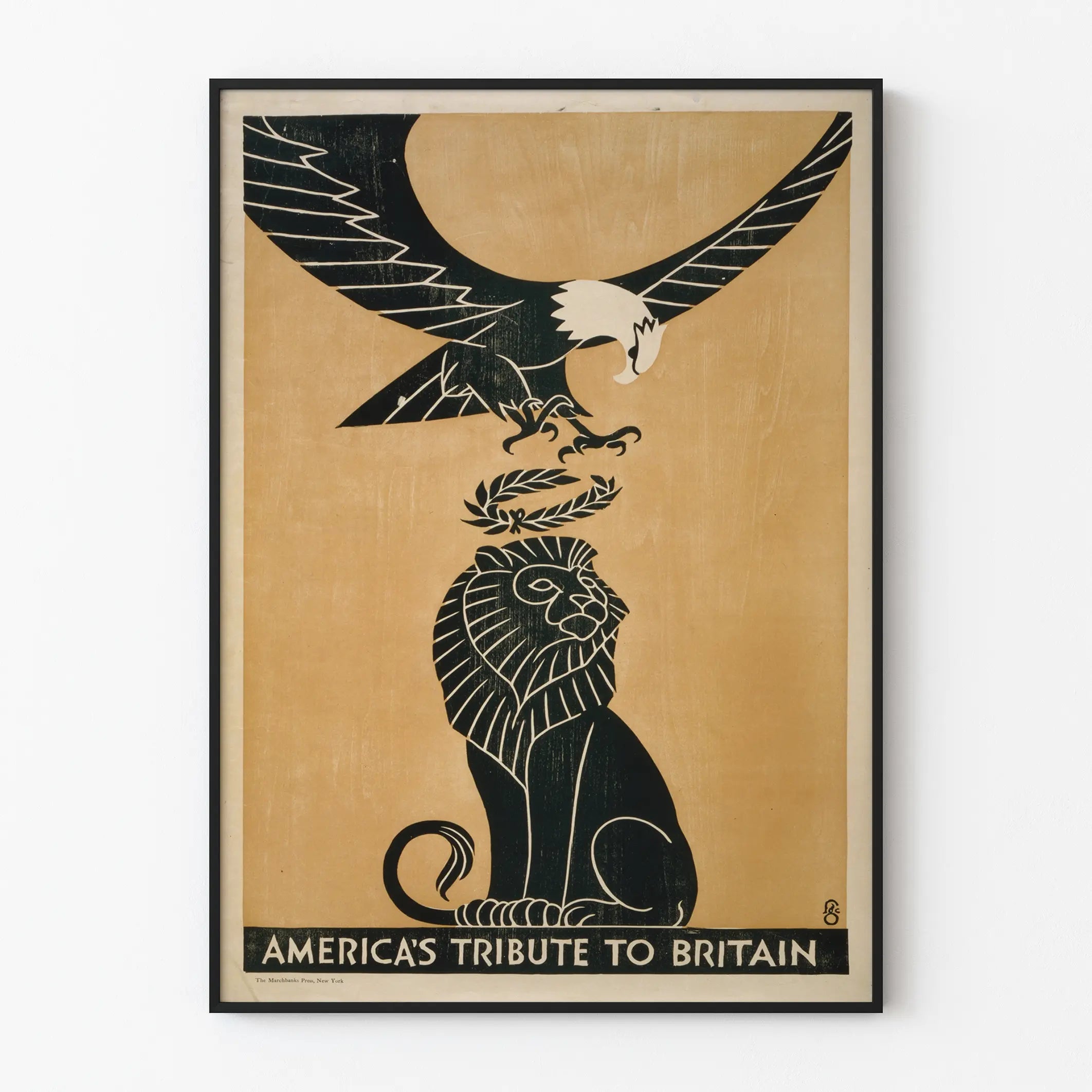 Descubra este cartel emblemático titulado « Homenaje de América a Gran Bretaña », una pieza de decoración mural que simboliza la alianza y el respeto entre Estados Unidos y Gran Bretaña. Este cartel ilustra un majestuoso águila estadounidense sosteniendo una corona de laurel sobre un león británico, evocando la fuerza, la dignidad y el homenaje mutuo entre estas dos naciones. El diseño en negro sobre fondo beige ofrece un contraste impactante, resaltando la finura de los rasgos y la potencia de las figuras animales, una estética que se integra perfectamente en un interior contemporáneo o vintage.