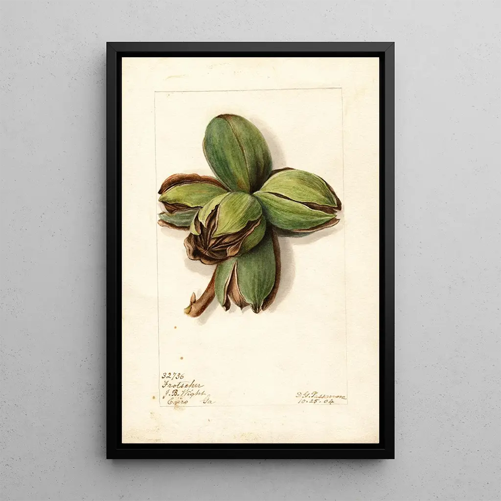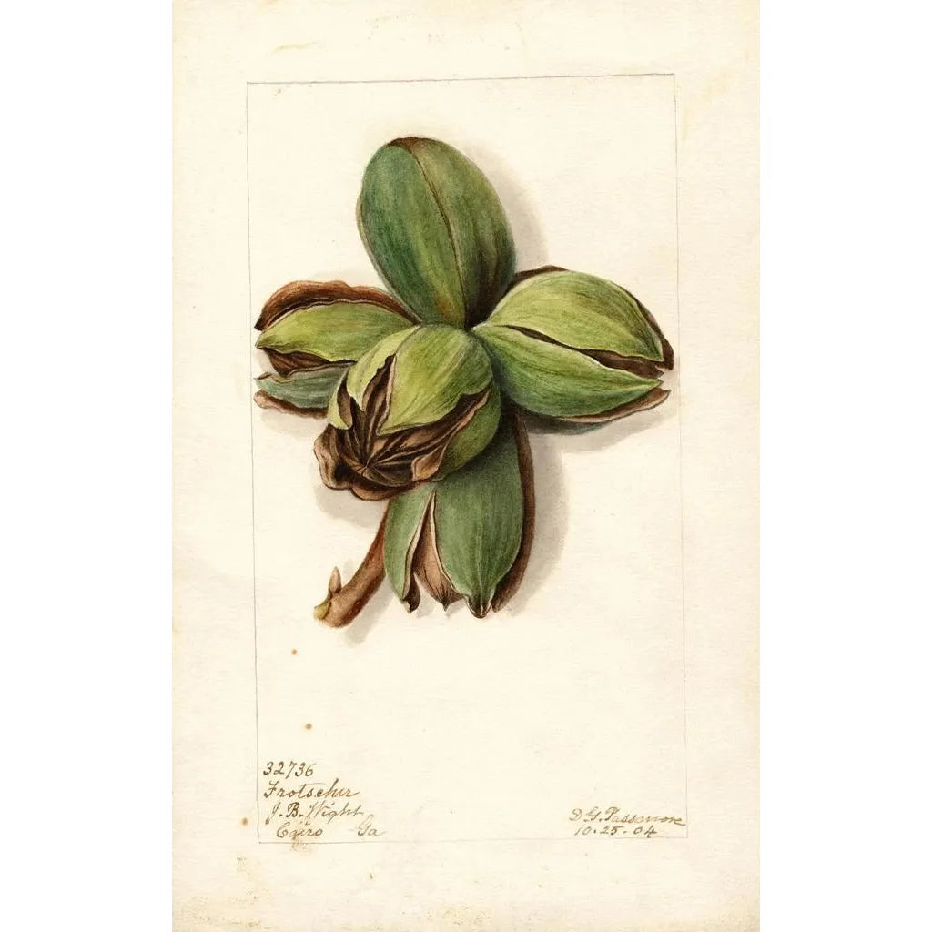 La impresión artística Carya Frotscher de Deborah Griscom Passmore es una celebración de la belleza natural, donde los matices de verde se mezclan con toques de marrón y oro. Esta obra, realizada con una técnica de acuarela refinada, evoca la majestuosidad de los árboles y la riqueza de la flora. Cada rama, cada hoja se representa con tal delicadeza que parece vibrar bajo la brisa. La atmósfera general del lienzo invita a una contemplación tranquila, transportando al espectador a un jardín exuberante, lleno de vida y color.