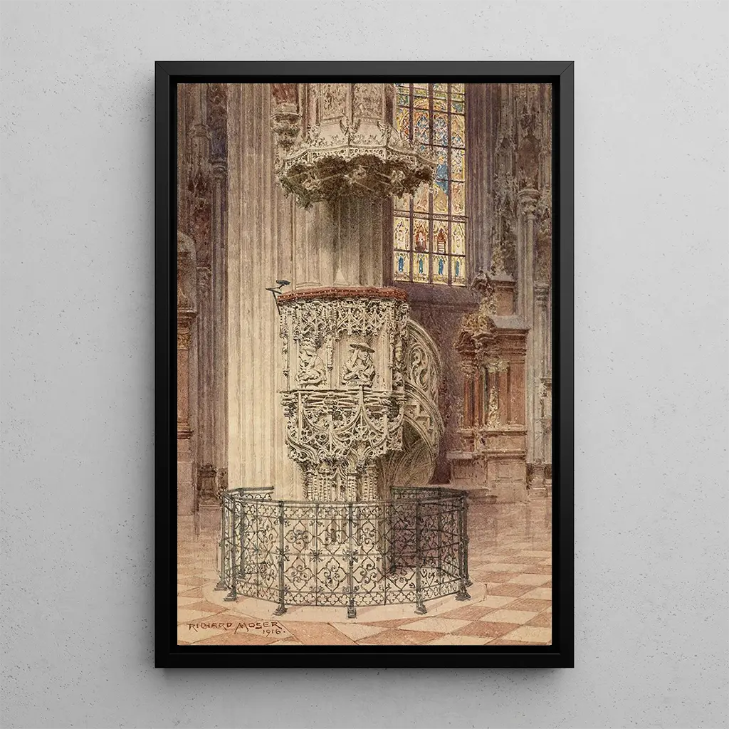 La impresión artística de la Cátedra de Pilgram, ubicada en la majestuosa Catedral de San Esteban de Viena, es una obra de arte fascinante que atrae la mirada por su complejidad y belleza. La riqueza de los detalles esculpidos, combinada con colores vibrantes, crea una atmósfera a la vez espiritual y majestuosa. Cada elemento de esta impresión artística cuenta una historia, desde motivos florales hasta figuras bíblicas, invitando a una exploración minuciosa. La luz que filtra a través de los vitrales acentúa las tonalidades y texturas, transformando este espacio sagrado en una verdadera obra de arte viva. Richard Moser: un artista en el corazón del legado vienés Richard Moser, aunque menos conocido que otros artistas de su época, desempeñó un papel esencial en la preservación del legado artístico de Viena. Su trabajo, influenciado por el neogótico y el barroco, refleja un período de renovación cultural a principios del siglo XX. Moser supo capturar la esencia de los monumentos históricos, rindiendo homenaje a la riqueza arquitectónica de su ciudad natal. Sus obras, incluida la impresión artística de la Cátedra de Pilgram, son testimonios valiosos del arte y la arquitectura vieneses, ofreciendo una perspectiva única sobre la evolución de estos estilos a lo largo del tiempo. Una adquisición decorativa con múltiples ventajas La impresión artística de la Cátedra de Pilgram es una adición valiosa a cualquier colección de arte, ideal para embellecer un salón, una oficina o un dormitorio. Su calidad de impresión excepcional y su atención a los detalles garantizan una fidelidad notable a la obra original. Este cuadro, con su carácter histórico y artístico, aporta un toque de sofisticación a su interior. Al elegir esta impresión artística, usted ofrece a su espacio una dimensión cultural y estética, celebrando al mismo tiempo el legado artístico de Viena.