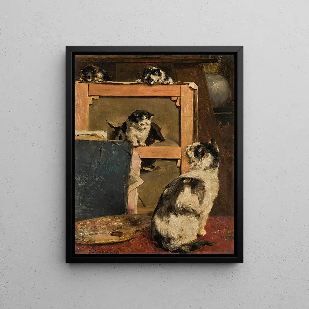 Charles Van Den Eycken, artista belga del siglo XIX, es reconocido por su talento para capturar la vida cotidiana y la naturaleza con una sensibilidad rara. Influenciado por el movimiento realista, supo trascender su época ofreciendo obras que hablan al alma. Su amor por los animales, en particular los gatos, se refleja en sus creaciones, donde logra inmortalizar instantes de vida con una autenticidad conmovedora. Van Den Eycken supo imponerse como un maestro en el arte de representar animales, colocándolos en el centro de sus composiciones. Su influencia perdura, inspirando
