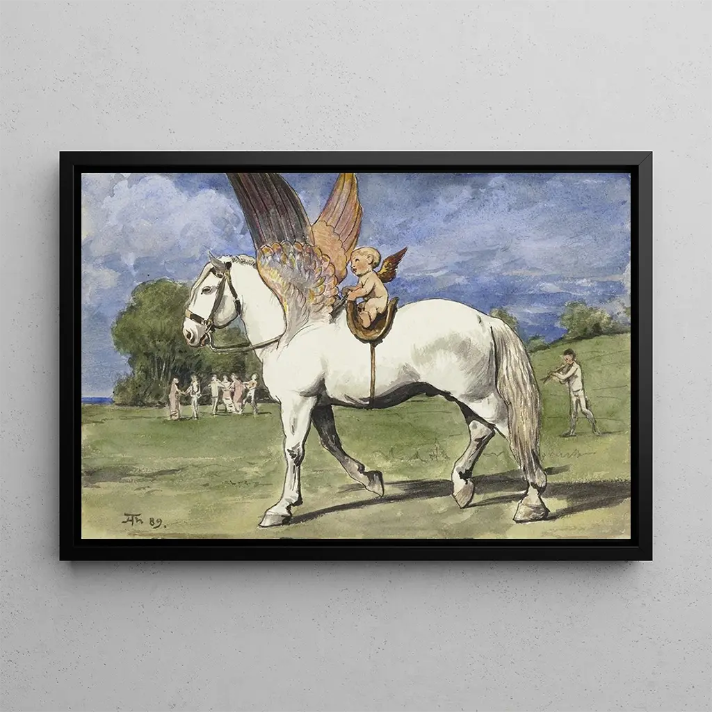 La impresión artística Chérubin sur Pégase, realizada por Hans Thoma, evoca un mundo mágico donde el cielo y la tierra se encuentran. Esta obra cautivadora representa un querubín, símbolo de inocencia y pureza, cabalgando un majestuoso Pégase. Los colores pastel, delicados y luminosos, crean una atmósfera onírica, mientras que los detalles minuciosos de las plumas y las nubes añaden una dimensión de ensueño. Thoma logra capturar la esencia del vuelo, invitando al espectador a escapar hacia tierras lejanas y fantásticas.