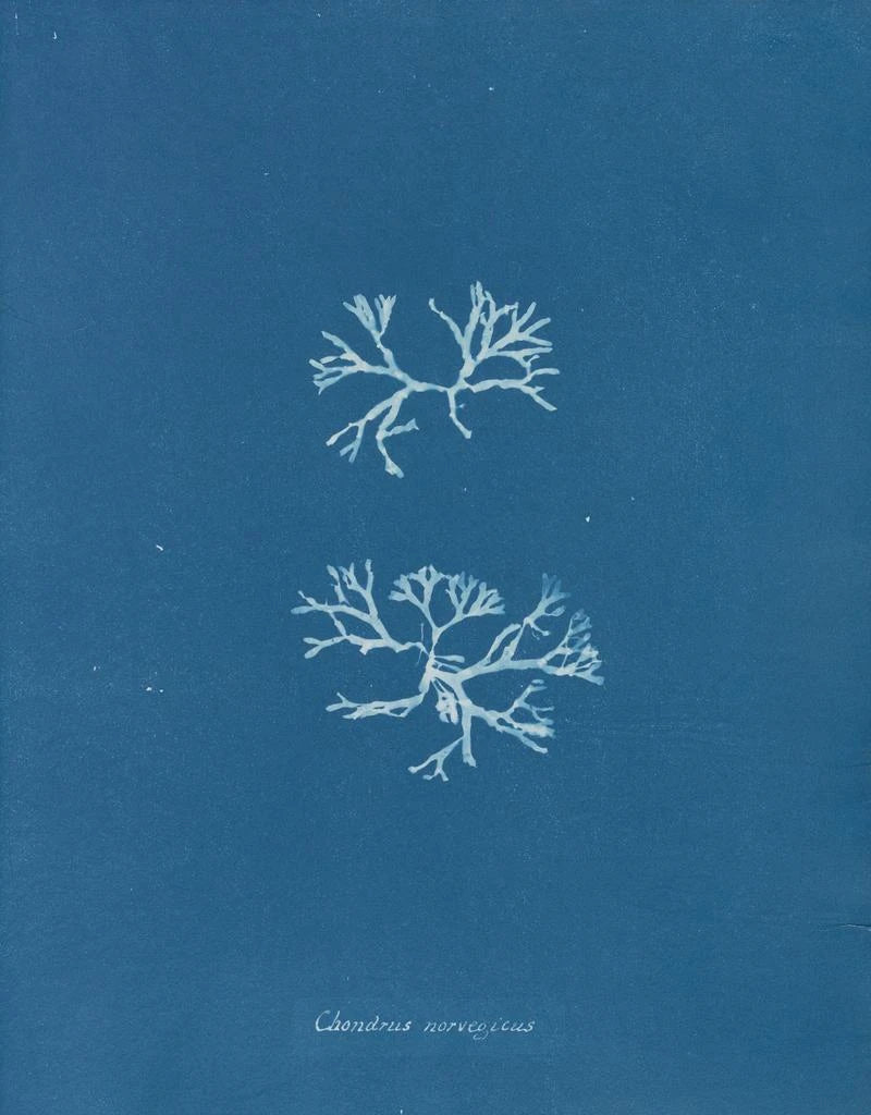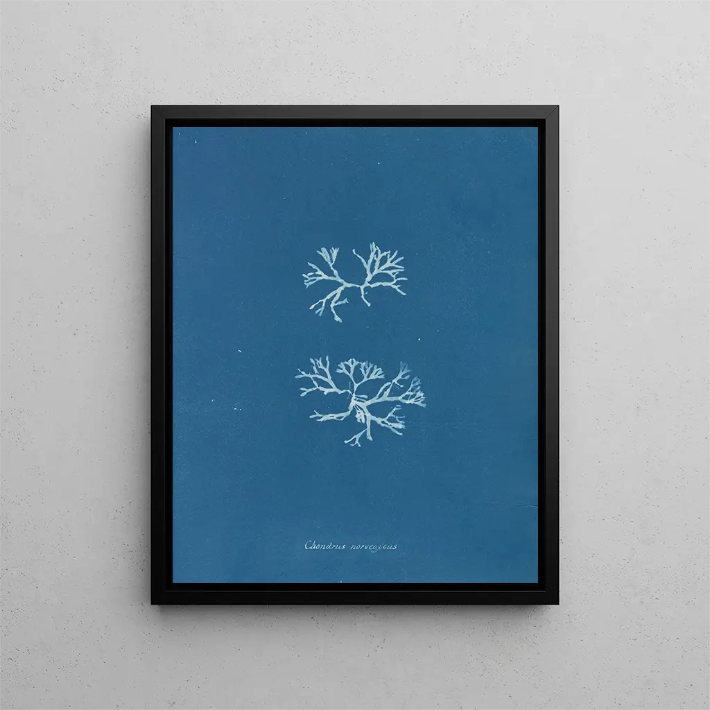 El estilo de Anna Atkins se caracteriza por un enfoque único de la fotografía, que ella desarrolló en una época en la que esta técnica aún estaba en sus inicios. A través de la impresión artística de Chondrus norvegicus, se percibe un dominio de los contrastes y las texturas que rinden homenaje a la belleza intrínseca del alga. La composición es a la vez simple y evocadora, resaltando las formas orgánicas y los matices delicados del objeto fotografiado. Cada detalle está cuidadosamente destacado, creando una armonía visual que invita a la contemplación. El uso de la cianotipia, un método de impresión que produce imágenes de un azul profundo, confiere a la obra una atmósfera a la vez serena y misteriosa. Esta elección técnica ilustra el deseo de Atkins de fusionar ciencia y arte, ofreciendo así una visión poética de la naturaleza.
