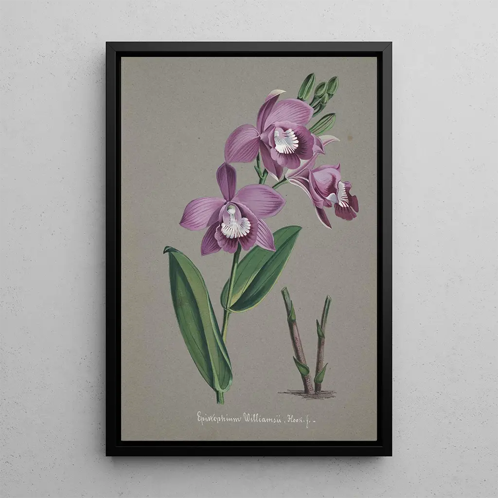 El artista anónimo de esta obra encarna una tradición floral que ha cautivado a los artistas a lo largo de los siglos. Las orquídeas, a menudo asociadas con el amor y la belleza, han sido temas privilegiados en el arte, especialmente durante períodos en los que la naturaleza era celebrada. Este cuadro, aunque anónimo, se inscribe en una rica tradición de impresión artística floral, donde cada detalle es cuidadosamente observado y reproducido. La ausencia de un nombre de artista no disminuye en absoluto el valor de esta obra, que sigue siendo un testimonio poderoso de la estética floral.