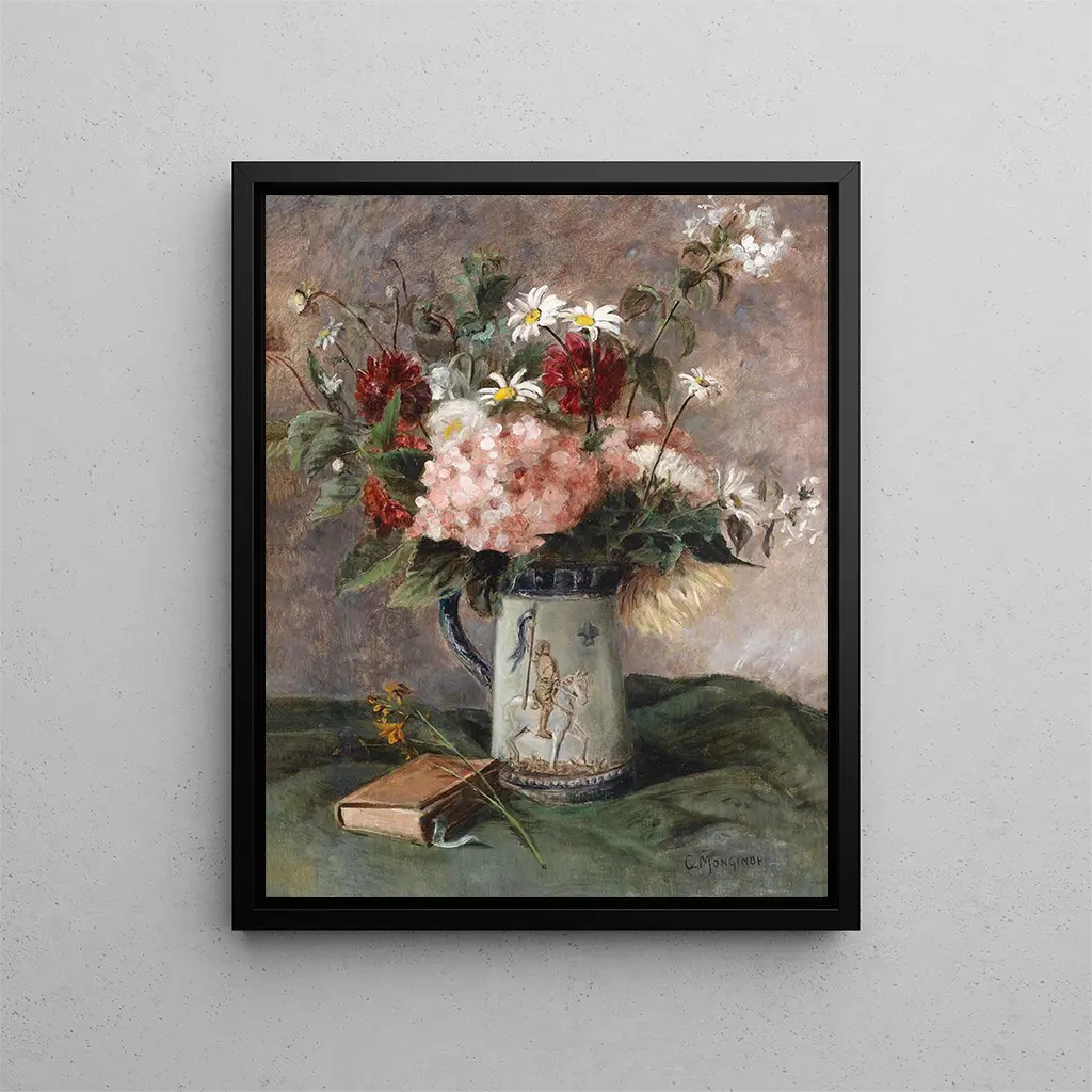 La singularidad de "Composición floral con libro" reside en la maestría técnica de Charles Monginot, quien logra capturar la luz y los colores con una finura notable. Las flores, pintadas con una minuciosidad casi fotográfica, parecen vibrar bajo el efecto de una luz suave, mientras que el libro, aunque secundario en la composición, aporta una profundidad narrativa a la obra. Las matices delicados de los pétalos y las sombras sutiles crean una atmósfera íntima, donde cada elemento del lienzo parece contar una historia. La yuxtaposición de las flores y el libro también simboliza un equilibrio entre lo efímero y lo duradero, entre la belleza natural y la búsqueda del conocimiento. Este cuadro es una oda a la riqueza de la vida, una celebración de las pequeñas cosas que nos rodean y que alimentan nuestro espíritu.