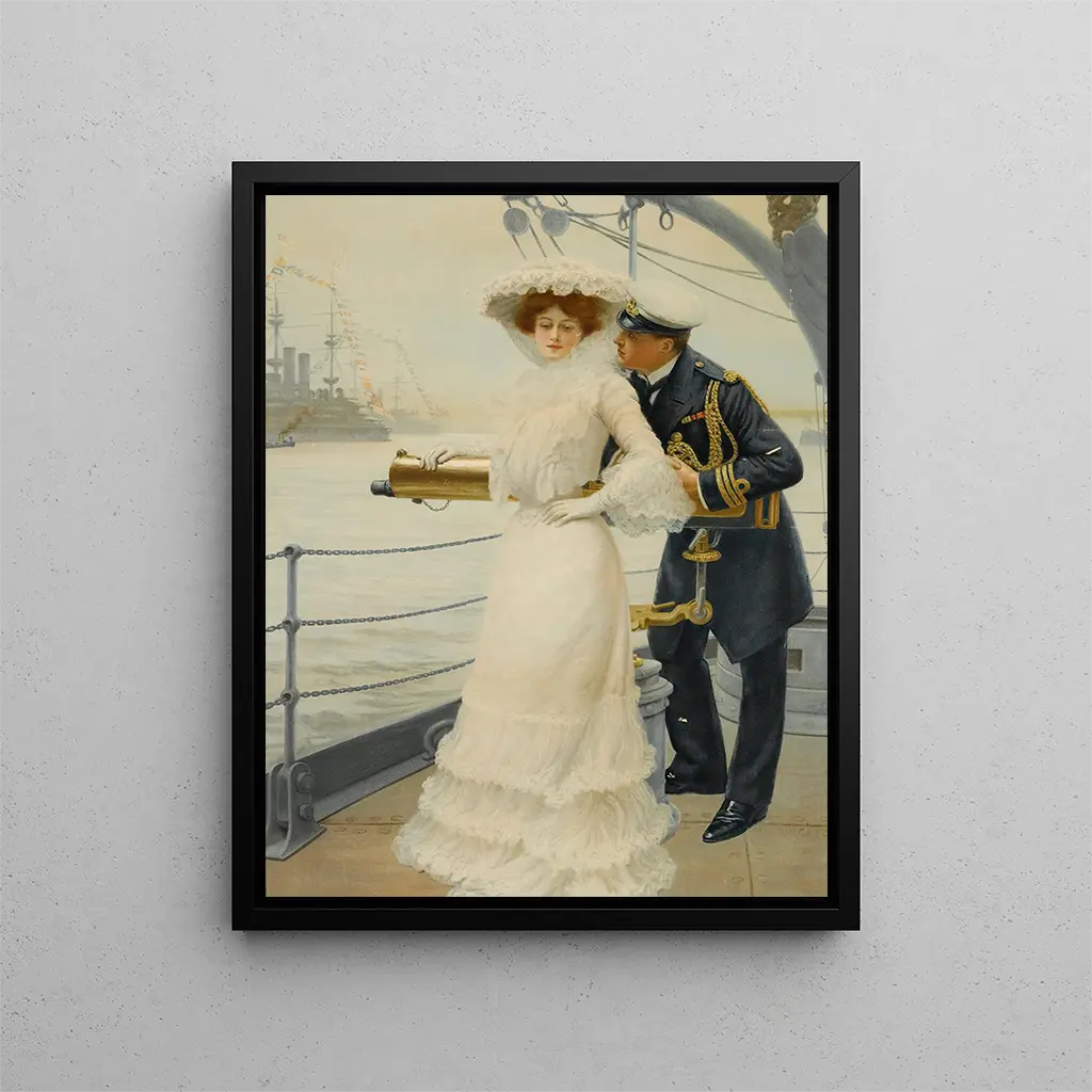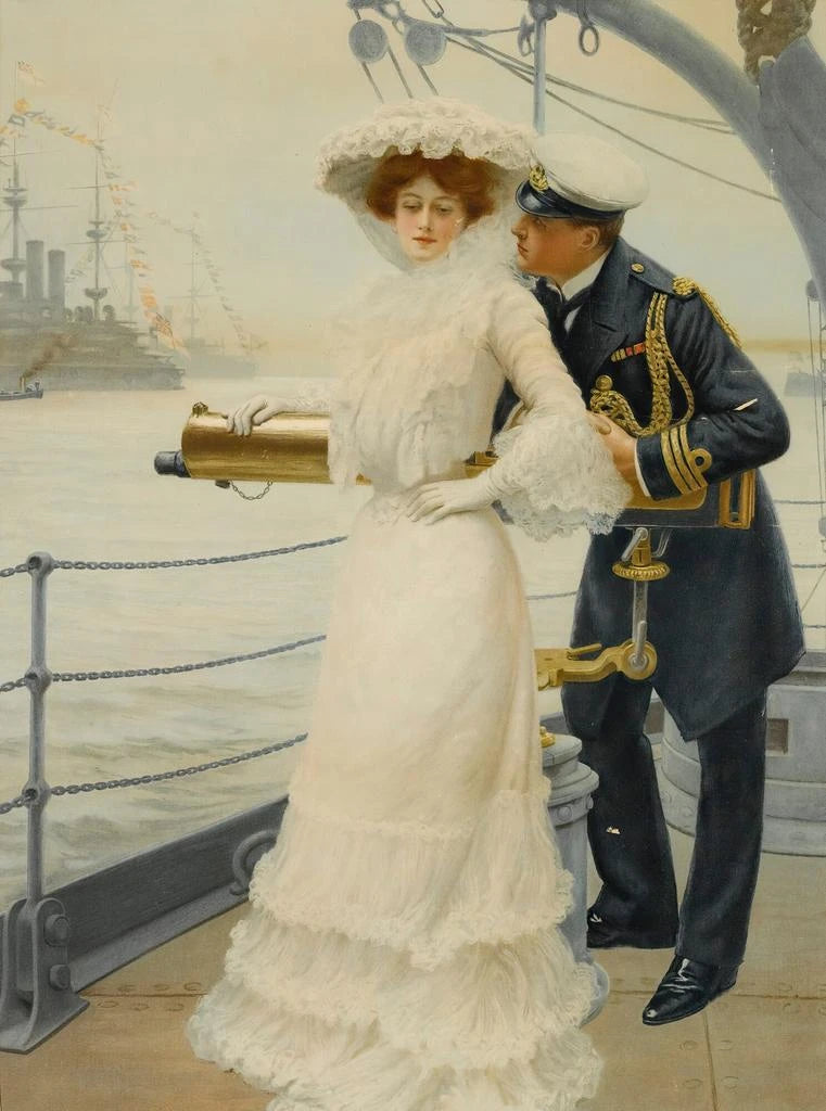La obra se distingue por su enfoque realista, típico de la Escuela inglesa, que sabe capturar la vida en toda su esplendor. Los juegos de luz y sombra, así como la finura de los detalles, testimonian una maestría técnica indiscutible. Los personajes, presentados en una postura tranquila, parecen entregarse a la suavidad de un momento de descanso. La paleta de colores elegida, a la vez suave y cálida, crea una atmósfera serena, propicia para la evasión. Cada elemento de la composición, desde la ropa de los personajes hasta los objetos circundantes, contribuye a reforzar esta sensación de calma y contemplación. La capacidad del artista para evocar emociones mediante el uso del color y la luz hace de esta obra una verdadera invitación a la ensoñación.