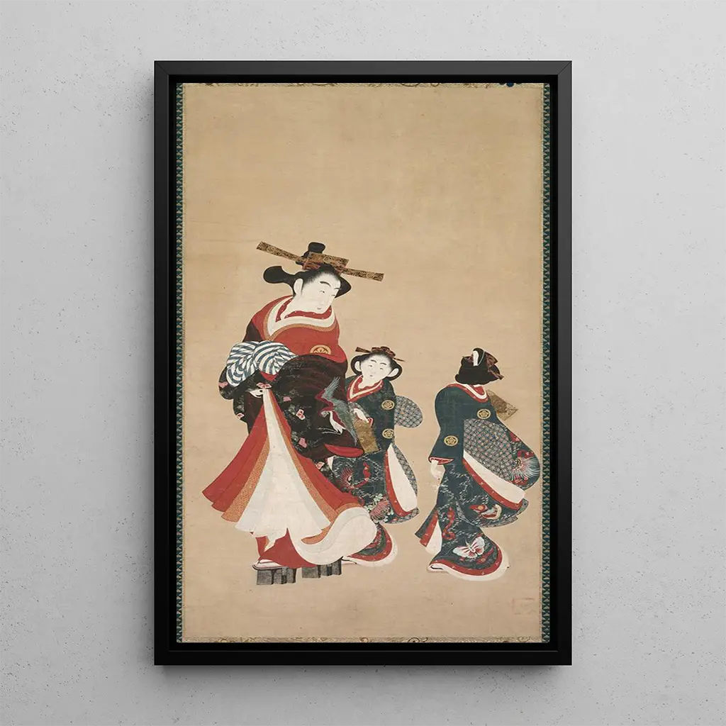 La impresión artística de "Courtisane y sirvientas" de Engetsud es una obra que sumerge al espectador en la intimidad de un momento capturado con delicadeza. Los personajes, vestidos con kimonos coloridos, se desplazan con gracia en un interior ricamente decorado. Las tonalidades de rojo, azul y oro se combinan para crear una atmósfera cálida y acogedora. La técnica de pintura sobre seda, típica del arte japonés, confiere a esta obra una textura única, casi táctil, que invita a la exploración visual de los detalles minuciosos de los trajes y accesorios.