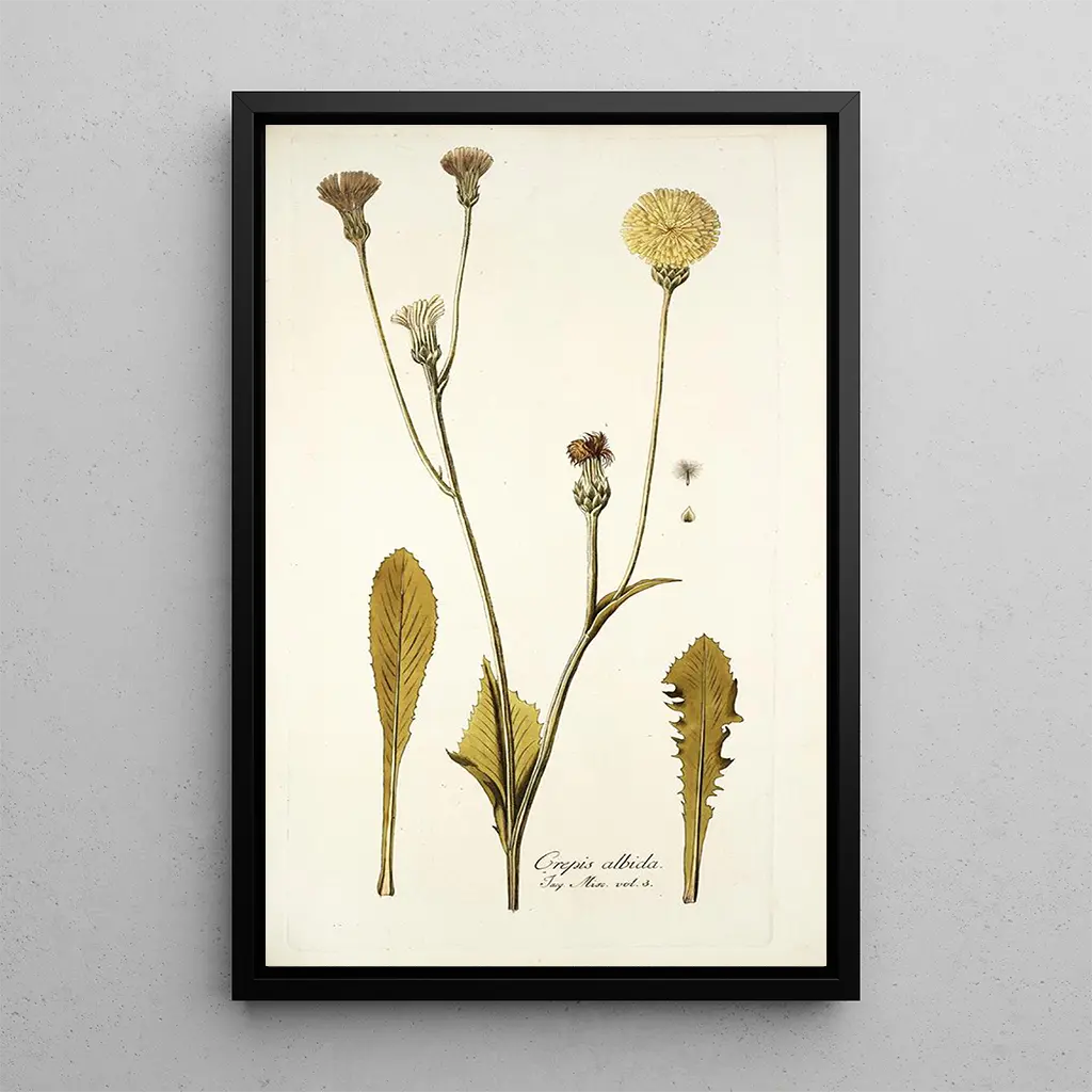 La impresión artística de Crepis albida nos transporta a un campo de flores donde la sencillez y la elegancia se encuentran. Esta obra, realizada con cuidado, destaca las delicadas tonalidades de amarillo y verde que caracterizan esta planta silvestre. La técnica de la acuarela, elegida por el artista, permite capturar la ligereza de los pétalos y la finura de los tallos, creando así una atmósfera de frescura y vitalidad. Cada detalle está cuidadosamente representado, invitando al espectador a apreciar la belleza efímera de la naturaleza.