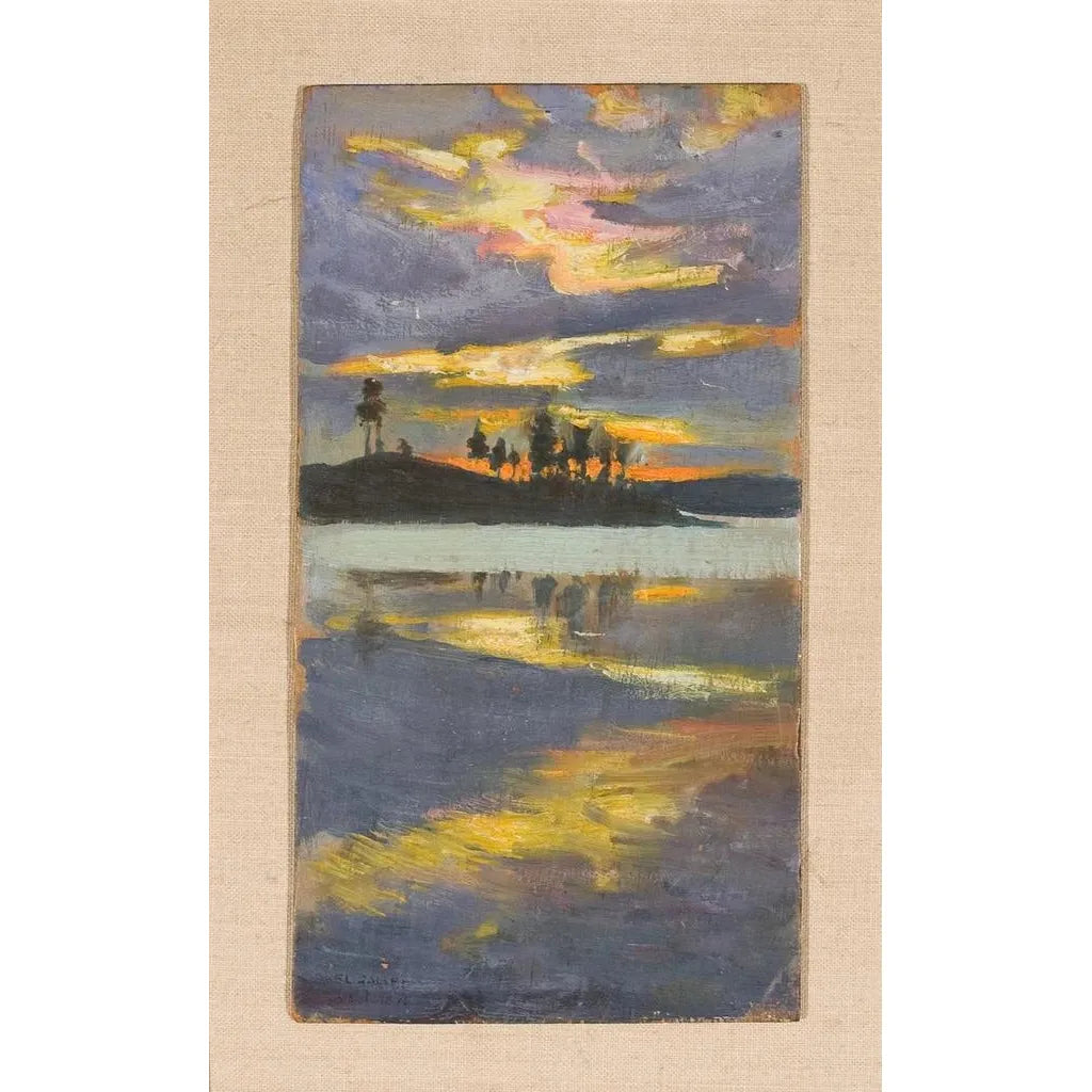 Crépúsculo de la tarde, una obra de Akseli Gallen-Kallela, captura la magia de una puesta de sol en un paisaje finlandés. Los tonos cálidos de naranja y violeta se mezclan armoniosamente, creando una atmósfera a la vez pacífica y misteriosa. La técnica de Gallen-Kallela, que juega con la luz y la sombra, da vida a esta escena, invitando al espectador a sentir la tranquilidad de una noche de verano. Las siluetas de los árboles se recortan contra el cielo ardiente, evocando una sensación de calma y contemplación, como si el tiempo se detuviera para admirar la belleza de la naturaleza.