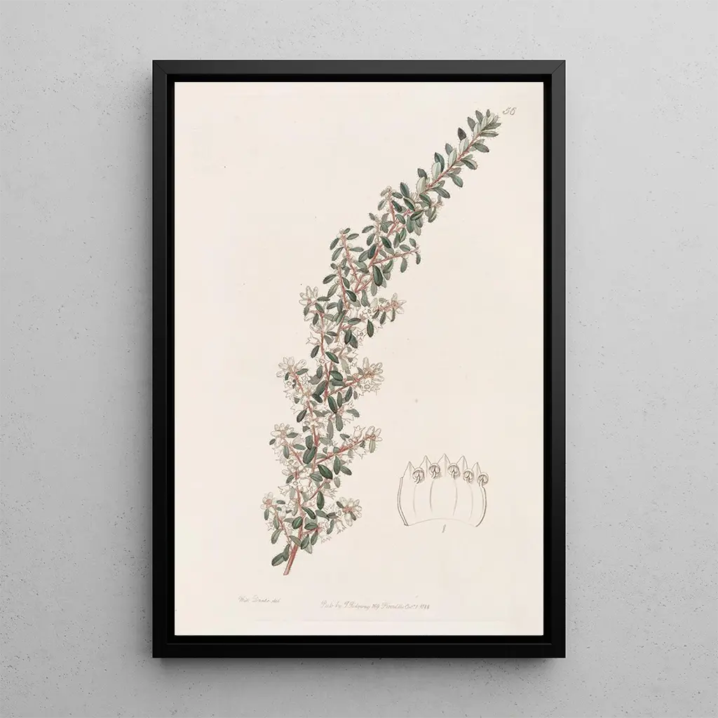 El cuadro Cryptandra doux de Sydenham Edwards revela una belleza sutil y delicada, donde cada flor parece bailar al ritmo del viento. Los tonos pastel, que van desde el rosa suave hasta el blanco brillante, crean una atmósfera dulce y tranquilizadora. La técnica de ilustración de Edwards, que combina precisión y sensibilidad, permite capturar la fragilidad de esta planta. La obra invita a una contemplación atenta, revelando las matices y los detalles que hacen toda la riqueza de la naturaleza.