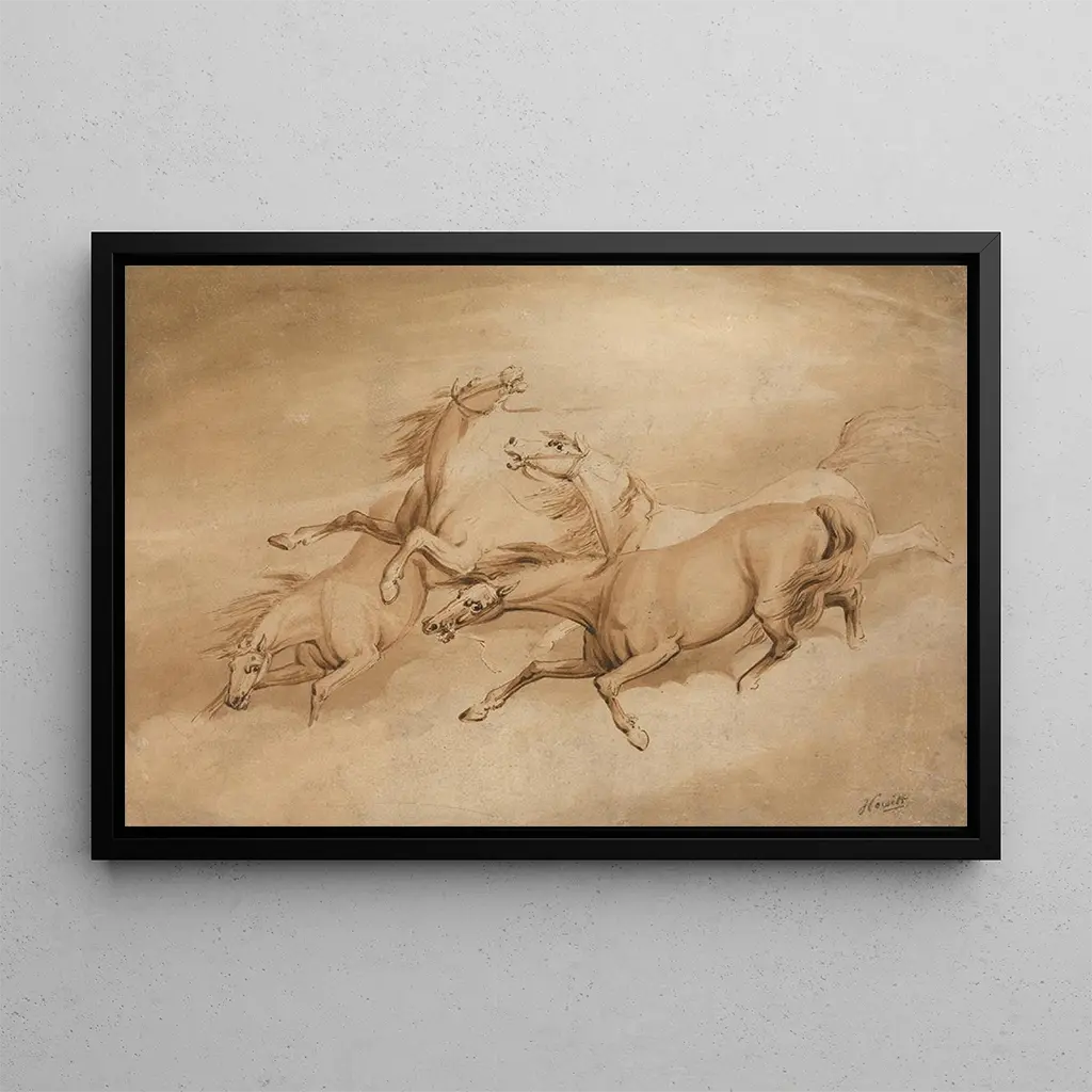 En esta obra emblemática, Quatre Chevaux au Galop, Samuel Howitt captura la potencia y la gracia de estos animales majestuosos. Los caballos, representados en un movimiento dinámico, parecen casi elevarse sobre el suelo, sus músculos tensos y su crin al viento. La paleta de colores, dominada por tonos cálidos y toques de blanco brillante, crea una atmósfera vibrante y viva. La técnica del artista, combinando acuarela y dibujo, da una impresión de ligereza y fluidez, transportando al espectador a un mundo donde la naturaleza reina en su máximo esplendor.
