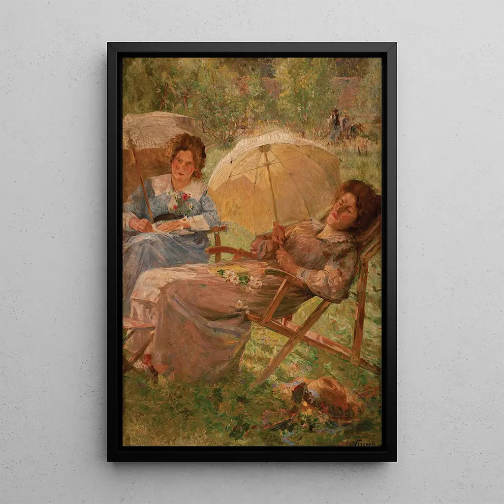 En "Cure de soleil", Eliseu Visconti nos transporta a un universo bañado de luz y calor. La tela, rica en colores vivos, evoca una escena de relajación veraniega donde figuras humanas se relajan bajo un sol radiante. Las tonalidades doradas y los toques de azul crean una atmósfera a la vez alegre y tranquilizadora, invitando al espectador a sentir la suavidad del verano. La técnica de impresión artística del artista, con sus trazos de pincel fluidos, confiere a la obra una dinámica vibrante, casi palpable. Cada detalle, desde las sombras delicadas hasta los reflejos luminosos, contribuye a una sensación de serenidad y felicidad compartida.