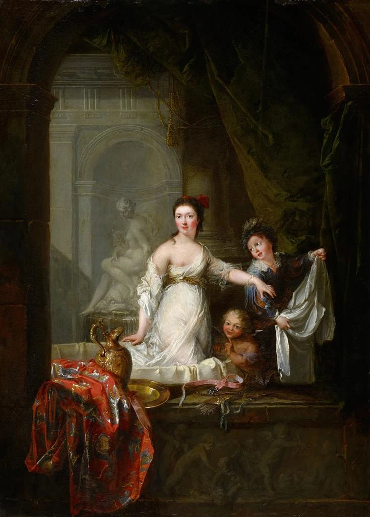 La toile "Dame dans le bain avec des cupidons" de Robert Tournières évoque une atmosphère de douceur et de sensualité. Cette œuvre représente une femme élégante, plongée dans un bain, entourée de charmants cupidons qui semblent jouer autour d'elle. Les couleurs pastel et les jeux de lumière créent une ambiance sereine et intime, tandis que les détails raffinés des drapés et des éléments décoratifs ajoutent une touche de sophistication. La composition, à la fois dynamique et harmonieuse, invite le spectateur à s'immerger dans cet instant de beauté et de tranquillité, où le temps semble suspendu.