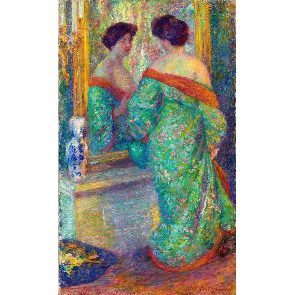 En esta obra cautivadora, la composición destaca a una mujer elegante, sumergida en una introspección silenciosa. Los colores suaves y las tonalidades delicadas crean una atmósfera serena, mientras que la luz juega sutilmente sobre las superficies reflectantes del espejo. La técnica de Carl Newman, que combina realismo y impresiónismo, invita al espectador a cuestionar la dualidad de la imagen y de la realidad. La dama, a la vez presente y distante, parece capturar un momento de reflexión personal, haciendo que esta impresión artística del cuadro "Dama reflejada en el espejo" sea aún más conmovedora.