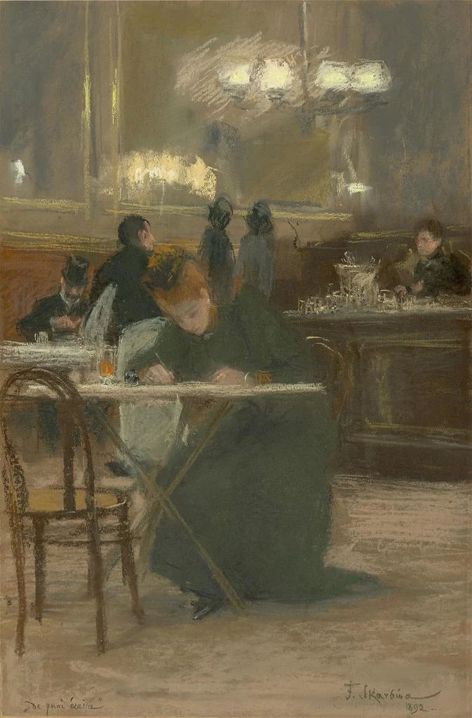 Franz Skarbina, pintor e ilustrador alemán del siglo XIX, suele asociarse con el movimiento realista. Nacido en 1849, fue influenciado por artistas como Gustave Courbet y Édouard Manet, quienes revolucionaron la representación de la vida cotidiana. Skarbina supo capturar momentos de la vida moderna con una sensibilidad única, convirtiéndose en una figura importante de su época. Su trabajo refleja no solo las preocupaciones sociales de su tiempo, sino también una profunda apreciación por la belleza de los gestos simples. "De qué escribir" encaja perfectamente en esta tradición, celebrando el acto creativo en toda su esplendor.