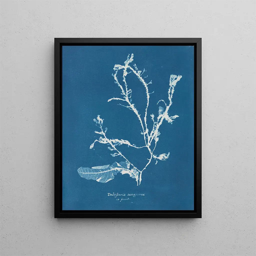 En el mundo delicado y fascinante del arte botánico, la obra "Delesseria sanguinea en fruit" de Anna Atkins se distingue por su belleza impactante y su enfoque innovador. Esta obra, realizada en el siglo XIX, es mucho más que un simple estudio de la naturaleza; representa una unión armoniosa entre ciencia y estética. Atkins, pionera de la fotografía y de la ilustración botánica, supo capturar la esencia misma de la naturaleza a través de una técnica que le era propia. Al explorar las sutilezas de las algas, nos invita a sumergirnos en un universo donde cada detalle cuenta una historia, donde cada matiz de color evoca una emoción. Estilo y singularidad de la obra Lo que hace que "Delesseria sanguinea en fruit" sea verdaderamente única es el uso de la cianotipia, un método de impresión fotográfica que confiere a la obra una profundidad y una luminosidad inigualables. Los tonos azul profundo que emergen de la composición resaltan la delicadeza de las algas, creando a la vez un contraste impactante con las formas orgánicas que adoptan. La precisión de los detalles, combinada con la sencillez de la presentación, permite al espectador contemplar la belleza intrínseca de la naturaleza, siendo consciente de la rigurosidad científica que subyace en esta obra. La delicadeza de los trazos y la fluidez de las formas evocan una danza sutil entre el arte y la biología, donde cada elemento está cuidadosamente elegido para revelar la complejidad de la vida marina. El artista y su influencia Anna Atkins, considerada a menudo como la primera mujer fotógrafa, abrió camino a muchas artistas y científicas que la siguieron. Su obra no se limita a una simple representación de las algas; encarna una visión del mundo donde el arte y la ciencia se encuentran, creando un diálogo enriquecedor. En una época en la que las mujeres estaban ampliamente subrepresentadas en el ámbito artístico, Atkins supo imponerse por su talento y determinación. Su influencia trasciende las fronteras de su tiempo, inspirando a generaciones de artistas a explorar las relaciones entre la naturaleza y el arte. En un mundo donde la fotografía se ha vuelto omnipresente, el trabajo de Atkins recuerda la importancia de la contemplación y la observación atenta del mundo que nos rodea.
