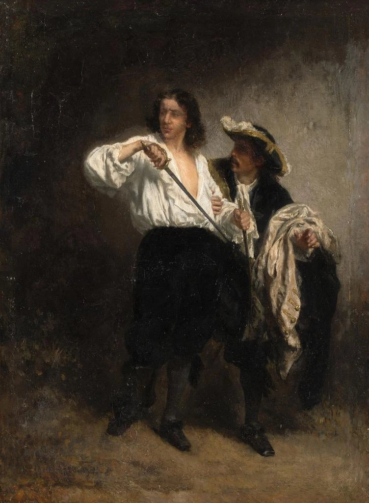 El estilo de August von Pettenkofen se distingue por su capacidad para combinar realismo y emoción. En "Después del duelo", los detalles minuciosos de los trajes y las expresiones faciales revelan una maestría técnica indudable. Los colores, elegidos con cuidado, acentúan las tensiones presentes en la escena, creando un contraste impactante entre la luz y la sombra. Este juego de luces aporta una dimensión casi teatral a la obra, reforzando el impacto emocional de la narración. El artista logra capturar no solo la acción, sino también los sentimientos complejos que de ella derivan, haciendo que la obra sea profundamente humana. Cada personaje, congelado en su expresión, cuenta una historia, y el espectador está invitado a cuestionar sus motivaciones y pensamientos.