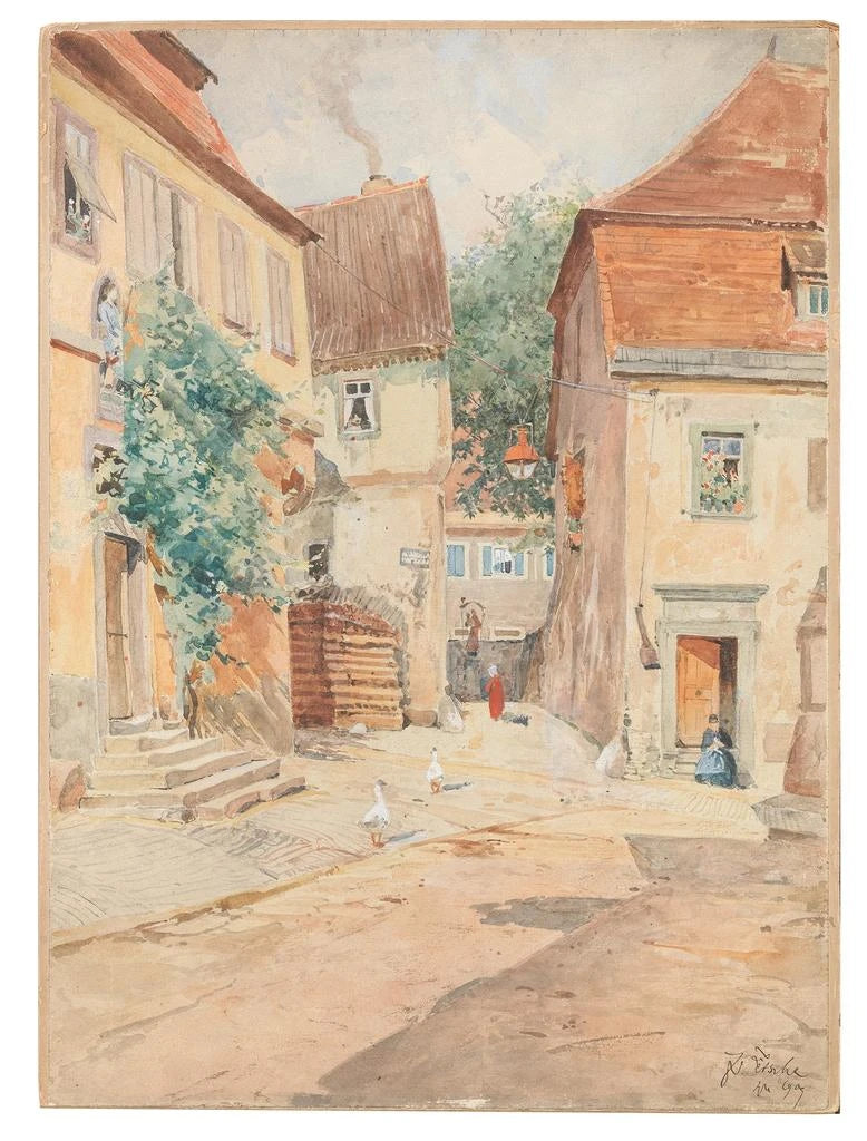 El estilo de Eduard Zetsche se distingue por su capacidad para combinar el realismo y la poesía. En Dettelbach, logra crear una atmósfera a la vez familiar y onírica. Los detalles minuciosos de la escena, ya sea de las texturas de los árboles o de los reflejos en el agua, testimonian un dominio técnico impresionante. Cada pincelada parece cargada de significado, cada matiz de color contribuye a una narración visual que transporta al espectador. La composición, cuidadosamente orquestada, invita a una contemplación prolongada, permitiendo a cada uno sumergirse en esta visión única del mundo. La obra se despliega como un poema visual, donde cada elemento participa en la construcción de un relato sensible, oscilando entre sueño y realidad.
