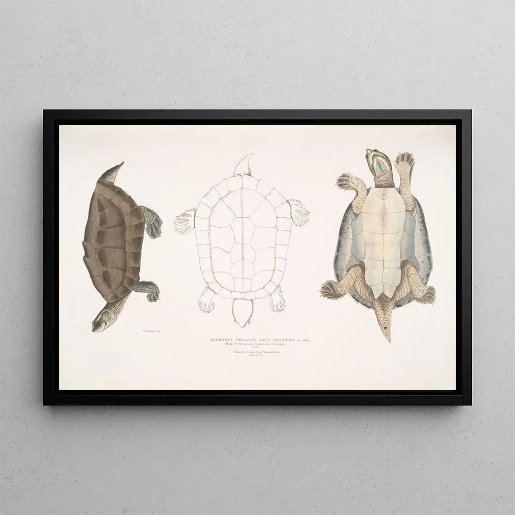 Dhongoka Terrapin Emys Dhongoka : una maravilla de la naturaleza revelada La impresión artística de Dhongoka Terrapin Emys Dhongoka, obra de John Edward Gray, nos sumerge en un universo donde la fauna acuática se destaca con una precisión notable. Los colores vibrantes y los detalles minuciosos de esta obra evocan la belleza salvaje de la naturaleza. La técnica de la acuarela, utilizada por Gray, permite capturar la delicadeza de las escamas y la fluidez del agua, creando así una atmósfera relajante y contemplativa. Cada pincelada parece contar una historia, la de un mundo submarino rico en biodiversidad, invitando al espectador a maravillarse ante la complejidad de la vida. John Edward Gray : un pionero de la ilustración zoológica John Edward Gray, naturalista y zoólogo británico del siglo XIX, desempeñó un papel crucial en la ilustración científica de la fauna. Su trabajo fue influenciado por las exploraciones de su época, donde el descubrimiento de nuevas especies alcanzaba su apogeo. Gray contribuyó a la clasificación de reptiles y anfibios, y sus obras, como la impresión artística de Dhongoka Terrapin Emys Dhongoka, reflejan su compromiso con la ciencia y el arte. Como conservador en el Museo Británico, también trabajó en la preservación de especímenes, convirtiéndolo en una figura emblemática de la historia natural. Una adquisición decorativa con múltiples ventajas Esta impresión artística de Dhongoka Terrapin Emys Dhongoka es una pieza decorativa que enriquecerá cualquier espacio, ya sea una sala, una oficina o un dormitorio. Su calidad de impresión y su fidelidad a los detalles del original hacen de esta obra una elección ideal para los amantes de la naturaleza y del arte. El atractivo estético de esta pieza reside en su capacidad para aportar un toque de serenidad y armonía a su interior, al mismo tiempo que fomenta conversaciones sobre la biodiversidad y la belleza del mundo natural.