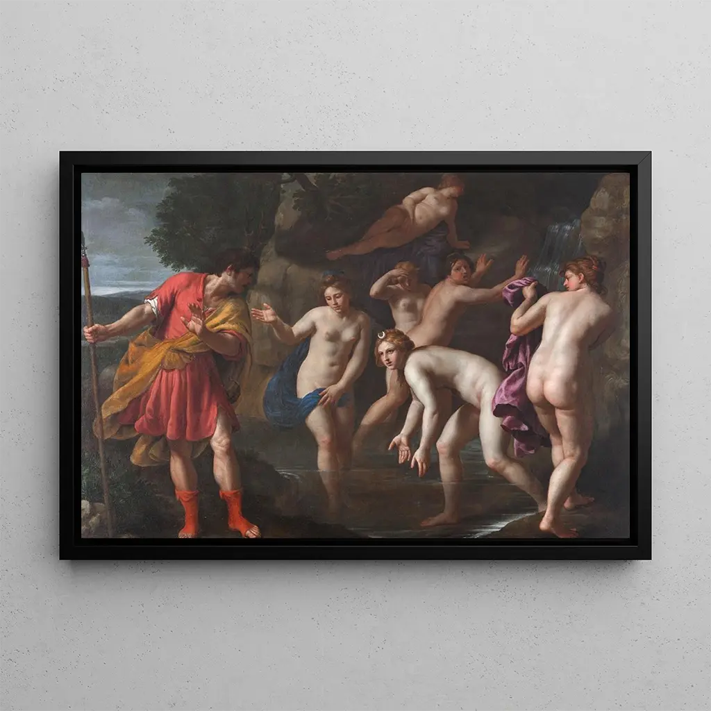 La impresión artística de "Diane y Acteón" de Alessandro Turchi ilustra un momento intenso del mito griego, donde la diosa de la caza, Diane, se encuentra cara a cara con Acteón, un cazador que la sorprendió. La composición dinámica, acentuada por colores vivos y contrastados, transmite una emoción palpable. Las figuras están representadas con gran expresividad, capturando el instante de sorpresa y tensión. La técnica de Turchi, que combina hábilmente el claroscuro y el movimiento, da vida a esta escena mitológica, sumergiendo al espectador en un relato lleno de simbolismo.