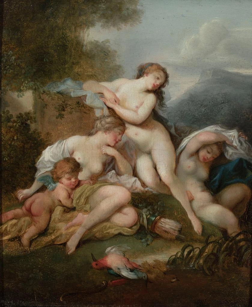 La obra se distingue por su estilo delicado y su tratamiento de las figuras humanas. La representación de Diane, majestuosa y serena, se realza con la gracia de las ninfas que la rodean. El juego de luz y sombra, hábilmente orquestado, crea una atmósfera casi mágica, donde cada personaje parece vivir en una danza eterna. Los colores, elegidos con sutileza, evocan una paleta natural, recordando los bosques y los ríos que la diosa protege. Esta armonía cromática se refuerza con los detalles minuciosos de las flores y las hojas, que testimonian una observación atenta de la naturaleza. La composición, equilibrada y dinámica, guía la mirada del espectador a través de la escena, invitando a una contemplación prolongada y a una inmersión en este universo mitológico.