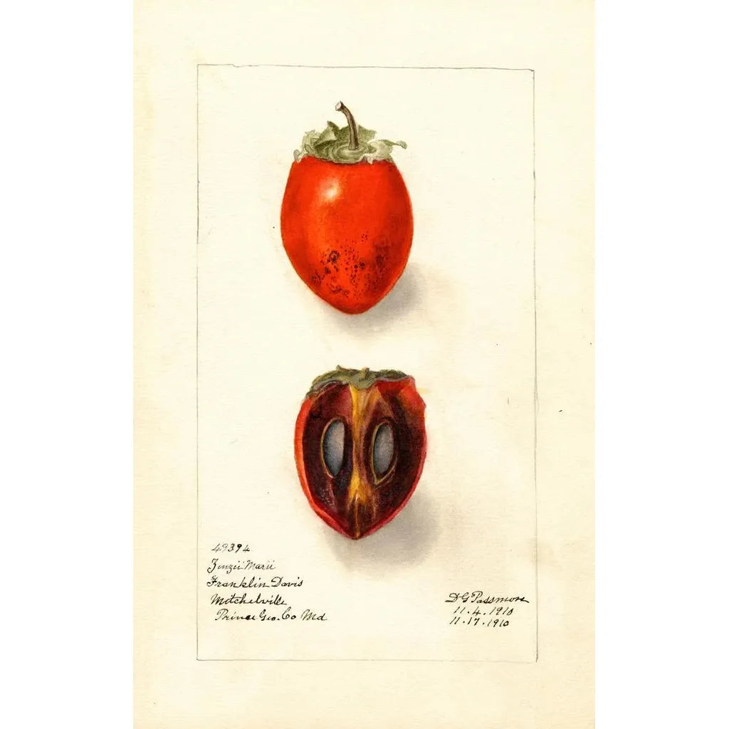 La impresión artística Diospyros Zengi Maru de Deborah Griscom Passmore es una verdadera celebración de la belleza natural. Esta obra, rica en detalles, nos sumerge en un universo donde las tonalidades de verde se mezclan con toques de luz dorada, creando una atmósfera a la vez relajante y revitalizante. La técnica de acuarela, dominada con delicadeza, permite plasmar la finura de las hojas y los frutos, invitando al espectador a admirar la minuciosidad de cada elemento. El conjunto evoca una serenidad profunda, como si se pudiera casi sentir la suavidad de una brisa ligera a través de las ramas.