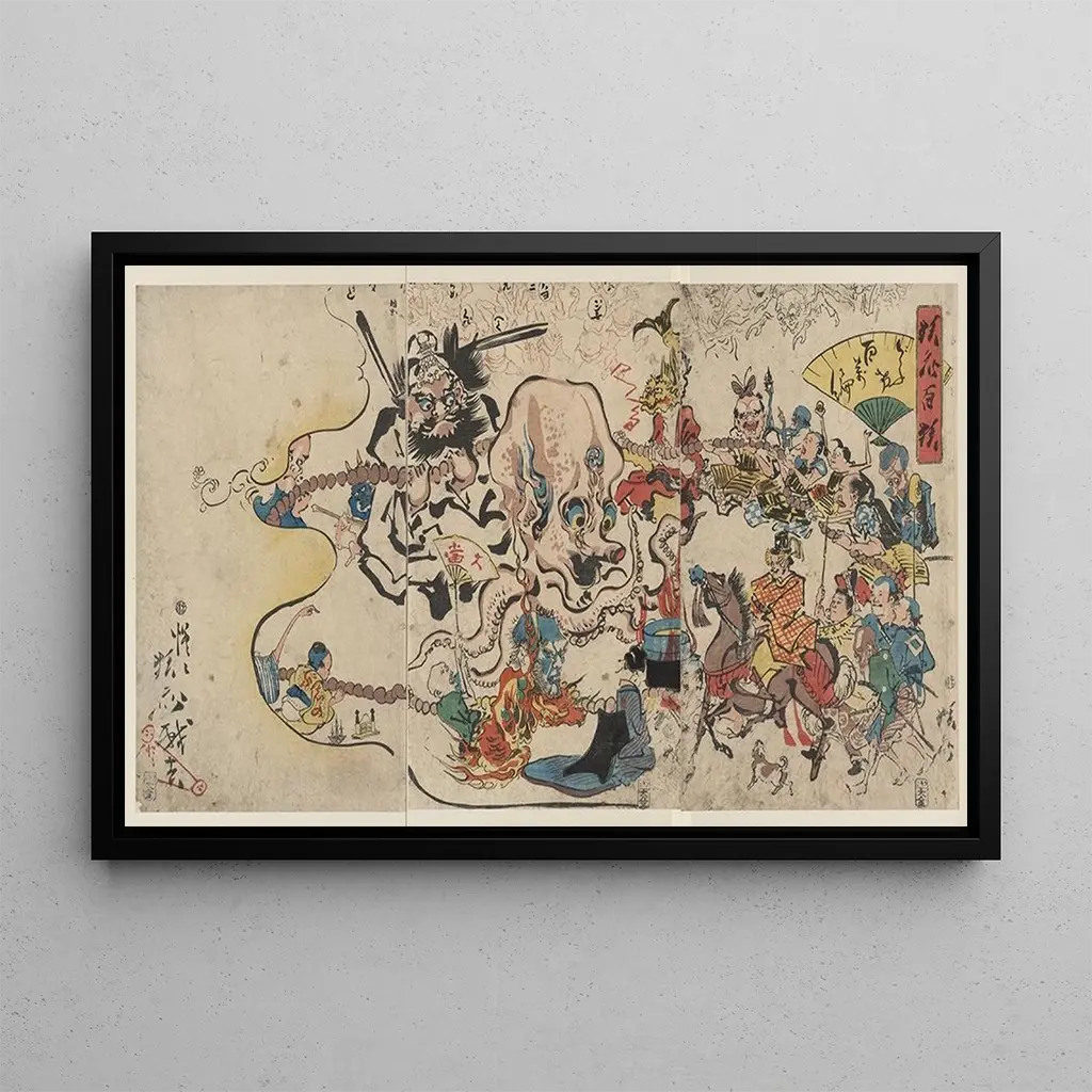 La impresión artística Dke Hyakumanben de Kawanabe Kyōsai es una obra vibrante que evoca una multitud de personajes y escenas de la vida cotidiana japonesa. Los colores vibrantes y los detalles minuciosos sumergen al espectador en un universo lleno de emociones e historias. La técnica de la estampa, típica de la época Edo, permite al artista jugar con la luz y la sombra, creando una atmósfera dinámica y viva. Cada figura, cada gesto, parece contar una historia, invitando a la contemplación y a la interpretación personal.