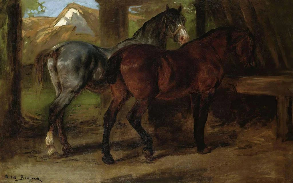 En la obra "Deux chevaux dans une écurie", Rosa Bonheur captura con una delicadeza notable la esencia misma de la vida animal. La composición, centrada en dos caballos majestuosos, evoca una atmósfera de serenidad y complicidad. Los colores cálidos y terrosos, asociados a toques de luz, dan vida a las texturas del pelaje y al entorno rústico de la ecurie. La técnica de Bonheur, que combina realismo y sensibilidad, permite sentir casi el calor que emanan los animales, creando así un vínculo emocional fuerte con el espectador.