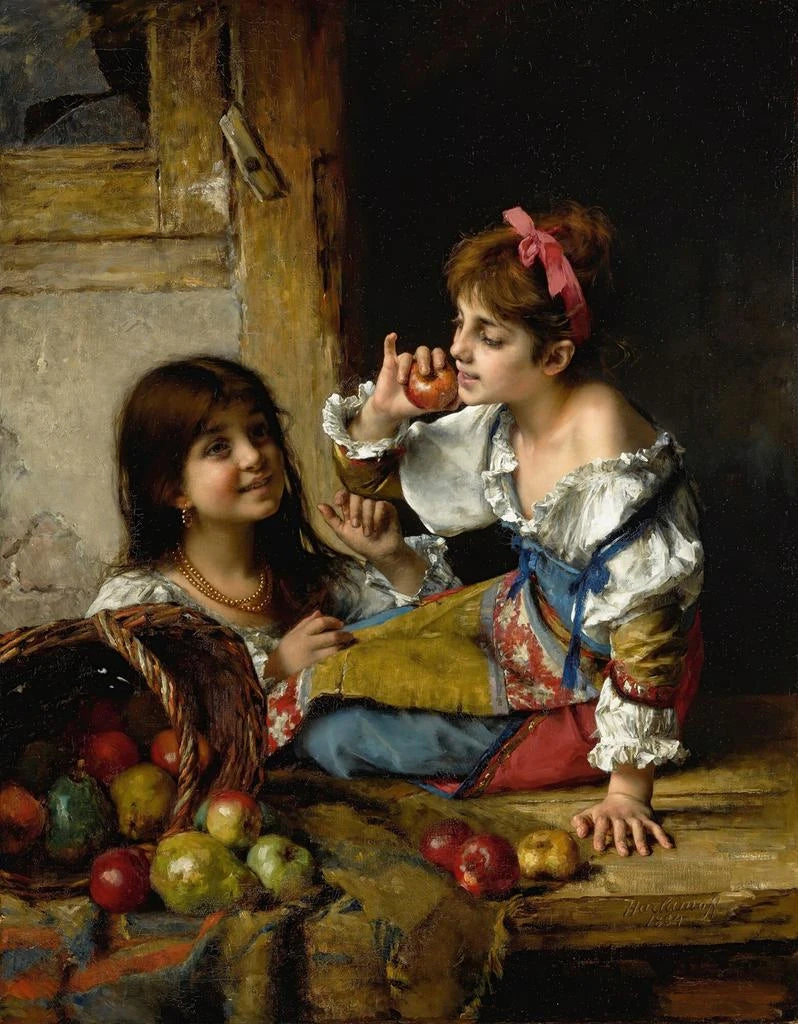 En el fascinante universo del arte, algunas obras logran capturar la esencia misma de la humanidad, revelando emociones profundas a través de gestos sencillos y expresiones delicadas. "Dos chicas con manzanas y peras" de Alexei Harlamoff es una de esas creaciones que invitan a la contemplación. Esta obra, pintada a finales del siglo XIX, presenta a dos jóvenes, unidas por la inocencia y la curiosidad, que comparten un momento de complicidad alrededor de frutas jugosas. Los colores vivos y los detalles minuciosos de esta escena evocan una atmósfera de dulzura y serenidad, transportando al espectador a un mundo pacífico donde la naturaleza y la infancia se encuentran. Estilo y singularidad de la obra El estilo de Alexei Harlamoff está marcado por una sensibilidad única, combinando realismo e impresionismo. En "Dos chicas con manzanas y peras", el artista logra crear una atmósfera vibrante gracias a una paleta de colores cuidadosamente seleccionada. Los tonos cálidos de las frutas contrastan con las matices delicados de los rostros de las jóvenes, resaltando su inocencia y asombro. La luz juega un papel crucial en esta composición, iluminando sutilmente los rasgos de los protagonistas mientras crea sombras suaves que añaden profundidad a la escena. Cada detalle, desde las arrugas de los pliegues hasta los reflejos de las frutas, demuestra una técnica impresionante, permitiendo al espectador adentrarse en la intimidad de ese momento robado. El artista y su influencia Nacido en Rusia, Alexei Harlamoff supo imponerse en el mundo del arte gracias a su enfoque innovador y a su capacidad para capturar la belleza de la vida cotidiana. Influenciado por los grandes maestros de su época, desarrolló un estilo personal que combina realismo y poesía. Sus obras, a menudo centradas en temas de la infancia y la naturaleza, revelan una profunda empatía por sus sujetos. Harlamoff logró tocar el corazón de muchos amantes del arte, y sus creaciones continúan inspirando a generaciones de artistas. "Dos chicas con manzanas y peras" encarna perfectamente