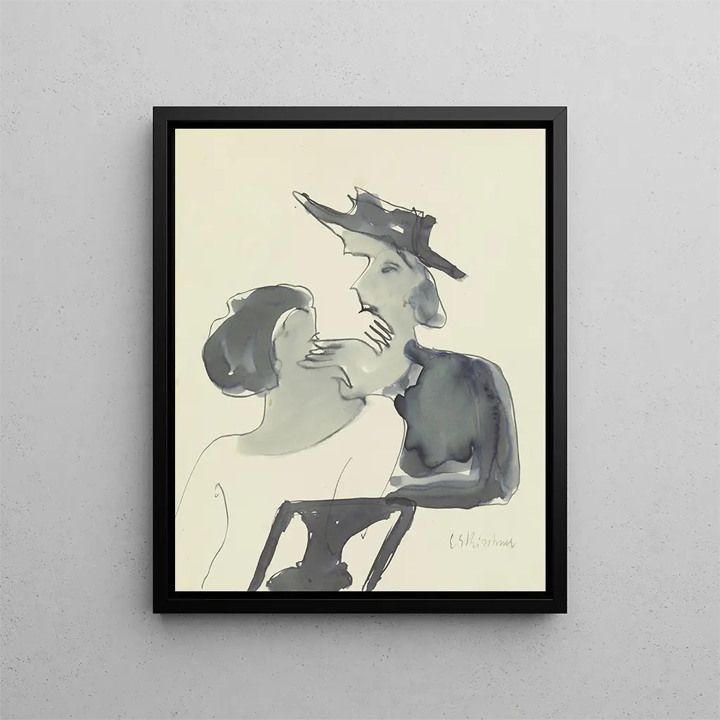 El estilo de Kirchner se caracteriza por una paleta audaz y trazos de pincel expresivos, que infunden una dinámica particular a sus composiciones. En "Dos mujeres que hablan", los colores vivos y contrastados, así como las formas estilizadas, crean una atmósfera a la vez íntima y perturbadora. Las figuras, aunque simplificadas, poseen una presencia palpable, como si estuvieran a punto de salir del cuadro para dirigirse directamente al espectador. Kirchner utiliza líneas angulares y formas deformadas para expresar las emociones complejas de los personajes, revelando así las tensiones subyacentes en su interacción. Esta obra es una verdadera exploración de la psicología humana, donde cada detalle cuenta y cada color evoca una sensación distinta.