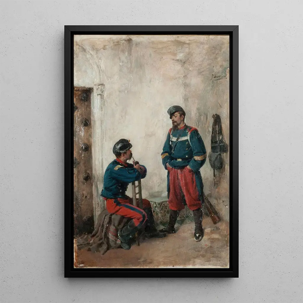 En la obra "Deux soldats", José Benlliure y Gil captura un momento de complicidad entre dos militares. La composición está marcada por colores cálidos y terrosos, evocando la calidez del sol español. Los detalles de los uniformes, pintados con una precisión notable, testimonian la habilidad del artista. La atmósfera que emana de esta obra es a la vez solemne y llena de camaradería, invitando al espectador a reflexionar sobre el sacrificio y el heroísmo de los soldados. Cada mirada intercambiada entre los protagonistas parece contar una historia, haciendo que esta impresión artística sea particularmente emotiva.