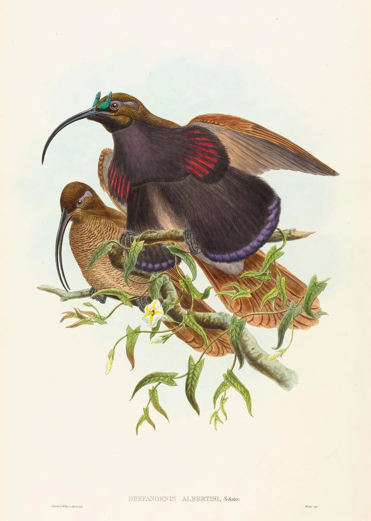 John Gould, célebre ornitólogo del siglo XIX, dejó una huella indeleble en el mundo de la ilustración naturalista. Su pasión por las aves lo llevó a explorar regiones remotas, donde descubrió e ilustró muchas especies, incluyendo Drevánornis albertisi. Influenciado por el movimiento naturalista, Gould supo combinar arte y ciencia, ofreciendo representaciones precisas y estéticas de las aves. Su trabajo no solo enriqueció el conocimiento ornitológico, sino que también inspiró a generaciones de artistas y científicos. La impresión artística de Drevánornis albertisi es un ejemplo perfecto de su dedicación a la belleza de la naturaleza.