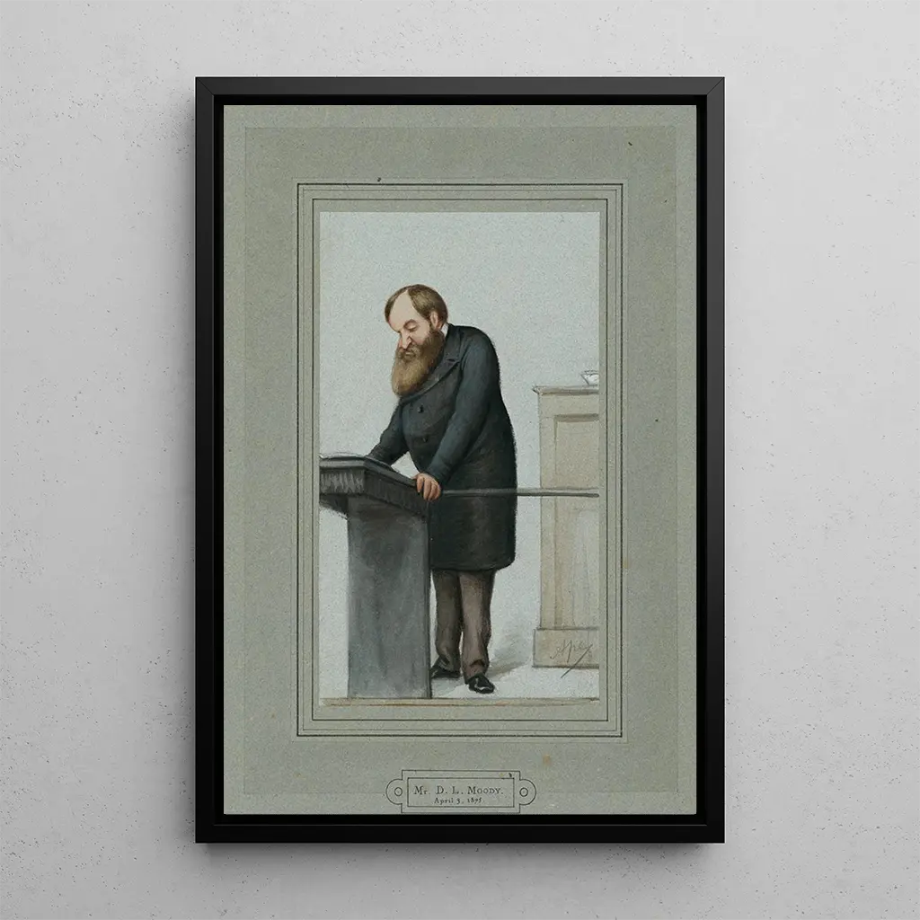 En la obra "Dwight Lyman Moody", Carlo Pellegrini retrata con fuerza al famoso predicador estadounidense, capturando su intensidad y pasión por la fe. La obra se distingue por su audaz uso de sombras y luces, que acentúan los rasgos decididos de Moody. Los colores ricos y profundos, combinando tonos de marrón y negro, refuerzan el aura carismática del personaje. La postura dinámica de Moody, con un gesto expresivo, evoca su compromiso ferviente en la predicación, haciendo de esta impresión artística una verdadera celebración de su legado espiritual.