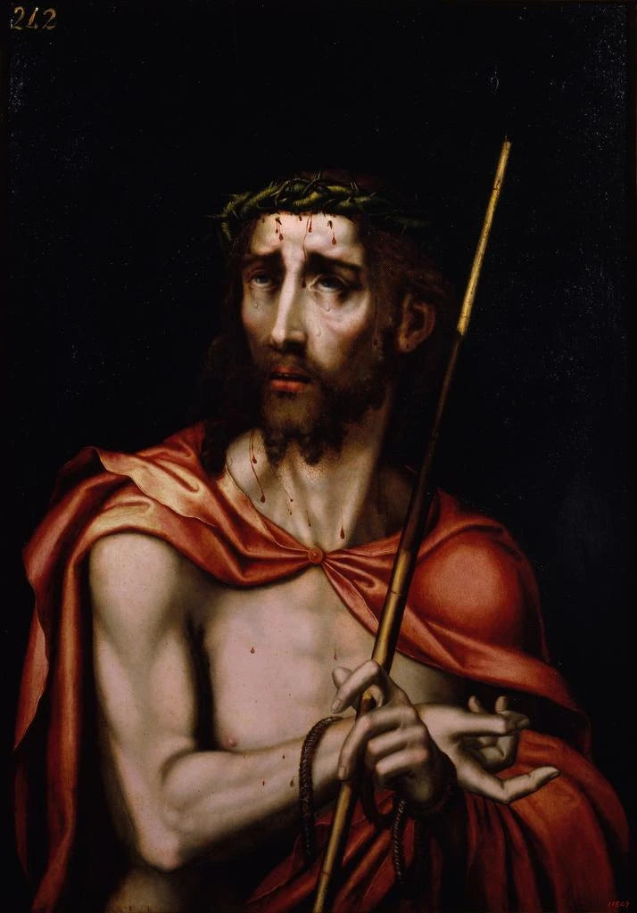 La obra "Ecce Homo" de Luis de Morales es una impresión artística que cautiva por su intensidad emocional. La pintura muestra a Cristo coronado de espinas, con un rostro marcado por el dolor y la tristeza. Los colores oscuros y terrosos predominan, creando una atmósfera de gravedad y recogimiento. La técnica de Morales, caracterizada por detalles minuciosos y una luz sutil, acentúa la profundidad de los sentimientos. Cada pincelada parece susurrar una historia de sacrificio y compasión, invitando al espectador a una contemplación silenciosa del sufrimiento humano.