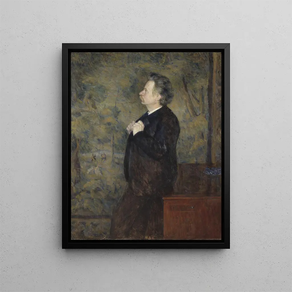 La obra "Edvard Grieg Compositor" de Erik Werenskiold es una pieza maestra que evoca no solo la personalidad del compositor noruego, sino también la esencia misma de la música romántica a finales del siglo XIX. Esta representación, impregnada de una profunda intimidad, nos transporta al universo de Grieg, donde la melodía y la emoción se encuentran. A través de esta impresión artística, el espectador está invitado a explorar las nuances de una época en la que el arte y la música fusionaban para dar lugar a obras maestras atemporales. La obra de Werenskiold, por su intensidad visual y su riqueza narrativa, revela un momento suspendido en el tiempo, donde cada detalle nos habla de una pasión ardiente por la creación artística. Estilo y singularidad de la obra El estilo de Erik Werenskiold se distingue por su capacidad para capturar la esencia de los personajes que retrata. En "Edvard Grieg Compositor", el artista utiliza juegos de luz y sombra para acentuar los rasgos del rostro del compositor, mientras integra elementos simbólicos que evocan su obra musical. La paleta de colores elegida, sutil y armoniosa, refleja la atmósfera melancólica y soñadora que se encuentra en las composiciones de Grieg. Cada pincelada parece susurrar una melodía, creando un diálogo entre la imagen y la música. Esta obra no se limita a representar a un hombre; encarna el espíritu mismo de la creación musical, uniendo lo visual y lo auditivo en una armonía perfecta. El artista y su influencia Erik Werenskiold, figura emblemática del arte noruego, supo marcar su época con un estilo que combina realismo y romanticismo. Formado en la Academia real de Bellas Artes de Oslo, fue influenciado por los grandes maestros de su tiempo, desarrollando una aproximación personal que le es propia. Su encuentro con artistas como Grieg sin duda alimentó su inspiración, permitiéndole explorar temas relacionados con la cultura noruega. Werenskiold también desempeñó un papel esencial en la promoción de la identidad nacional a través de su arte, capturando los paisajes y las personalidades que moldearon