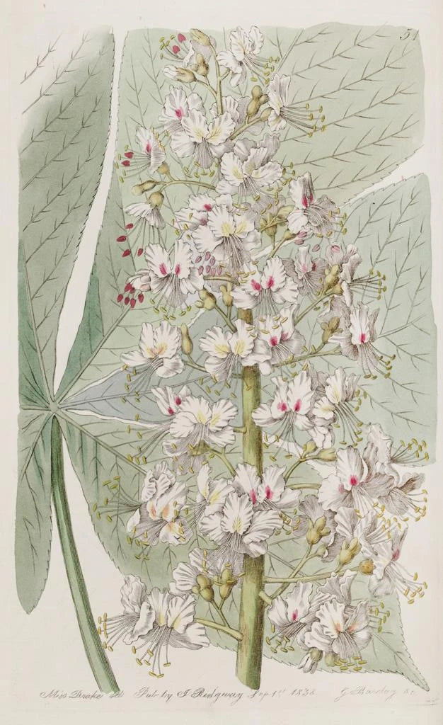 "Le Marronnier de l'Ohio" de Sydenham Edwards est une représentation vibrante et détaillée de cet arbre majestueux. Les teintes riches de vert et de marron, ainsi que les fleurs blanches éclatantes, créent une composition harmonieuse qui attire le regard. La technique de l’aquarelle, utilisée avec maîtrise, permet de rendre la lumière et l’ombre de manière subtile, donnant vie à chaque feuille et chaque fleur. L’atmosphère qui se dégage de cette œuvre évoque la tranquillité des paysages américains, invitant le spectateur à s'immerger dans la beauté naturelle de cet arbre emblématique.