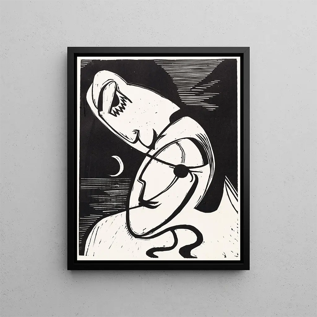 En esta impresión artística de la obra "El Beso", Ernst Ludwig Kirchner retrata una escena de amor intenso, donde los cuerpos se entrelazan en un abrazo apasionado. Los colores vibrantes, que van desde el rojo ardiente hasta el azul profundo, crean una atmósfera eléctrica y sensual. La técnica de Kirchner, caracterizada por formas estilizadas y trazos de pincel expresivos, da vida a esta unión, al mismo tiempo que evoca una cierta fragilidad. La obra trasciende el simple acto de beso, invitando al espectador a sentir la profundidad de las emociones humanas.