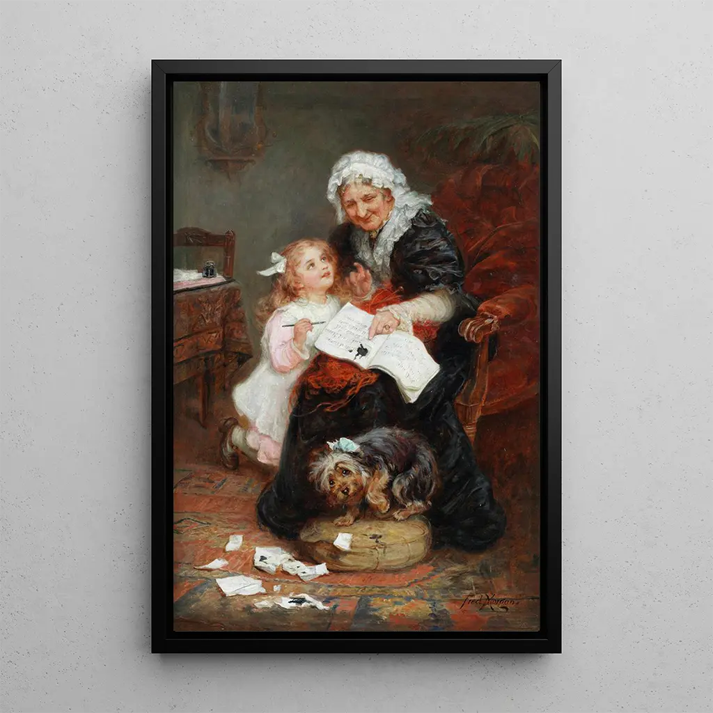 Frederick Morgan, activo a finales del siglo XIX y principios del XX, es reconocido por sus representaciones de la vida doméstica y de los animales. Influenciado por el movimiento victoriano, supo capturar momentos de ternura y complicidad entre humanos y animales. Morgan a menudo pintaba escenas de la vida cotidiana, destacando la belleza de las interacciones simples. Su estilo, impregnado de realismo, permite sentir una profunda conexión con sus temas. "El cachorro penitente" es emblemático de su obra, ilustrando su talento para evocar emociones a través de representaciones delicadas y conmovedoras.