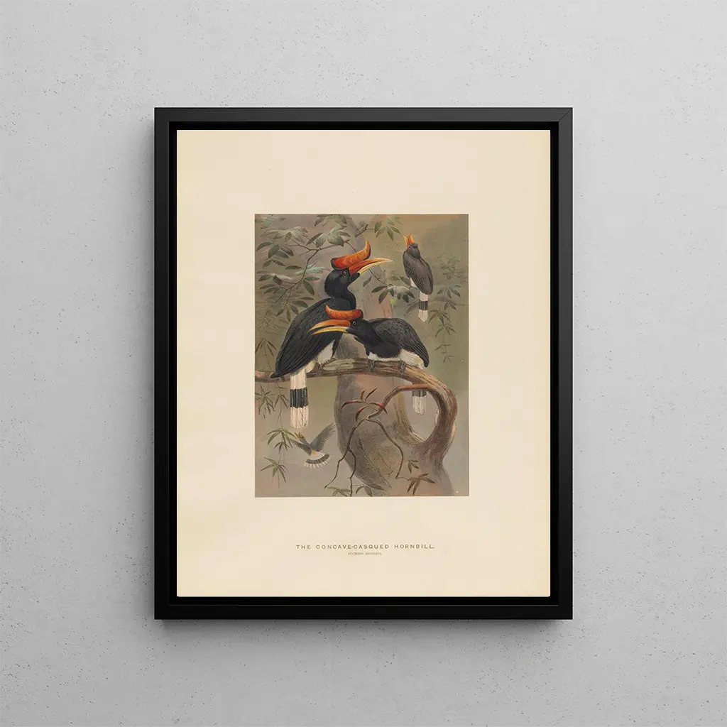 El Calao con casco cóncavo, con su imponente pico y su plumaje brillante, se destaca en esta impresión artística vibrante. Joseph Wolf logra capturar no solo la belleza física de este ave, sino también su carácter majestuoso. Los colores vivos, que van del amarillo al negro, se combinan armoniosamente, creando un cuadro a la vez dinámico y relajante. La técnica de Wolf, que combina precisión y sensibilidad, da vida a este ave fascinante, invitando al espectador a sumergirse en su universo. Cada detalle, desde la mirada penetrante del calaos hasta la textura de sus plumas, es una invitación a la maravilla.