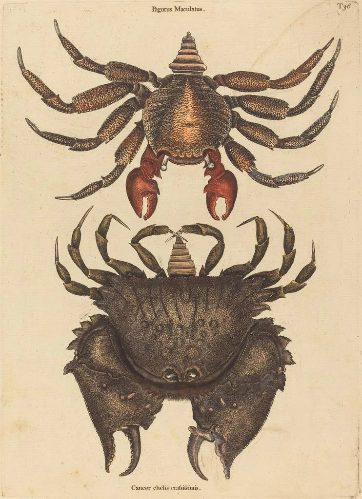 Mark Catesby, activo en el siglo XVIII, es considerado uno de los primeros naturalistas en documentar la fauna y la flora americanas. Sus viajes por América del Norte y las Antillas le permitieron realizar ilustraciones precisas y detalladas, como la del Cangrejo Rocoso Moteado Rojo. Influenciado por el movimiento barroco, su estilo combina precisión científica y estética artística. Catesby desempeñó un papel fundamental en la educación de su época, proporcionando ilustraciones que enriquecieron el conocimiento de las especies y sensibilizaron al público sobre la belleza de la naturaleza.